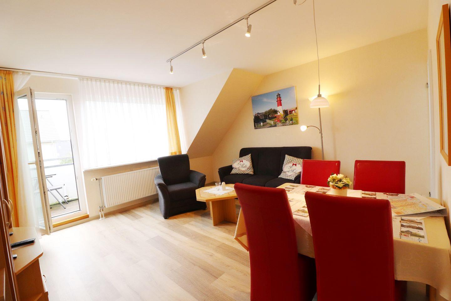 Die 3-Raum-Wohnung im 2. Stock hat ca. 55 m² und 2 Schlafzimmer (1 x Doppelbett, 2 x Einzelbett, 2. TV im Schlafzimmer vorhanden). Die Wohnung hat einen Balkon, eine separate Küche und ein Duschbad. Die Küche hat einen Geschirrspüler, Wasserkocher, Kaffeemaschine, Toaster, sowie Geschirr für den täglichen Bedarf sind ebenfalls vorhanden. Haustiere sind nicht erlaubt. Alle Wohnungen im Haus "Dithmarschen" verfügen über WLAN in der Wohnung.