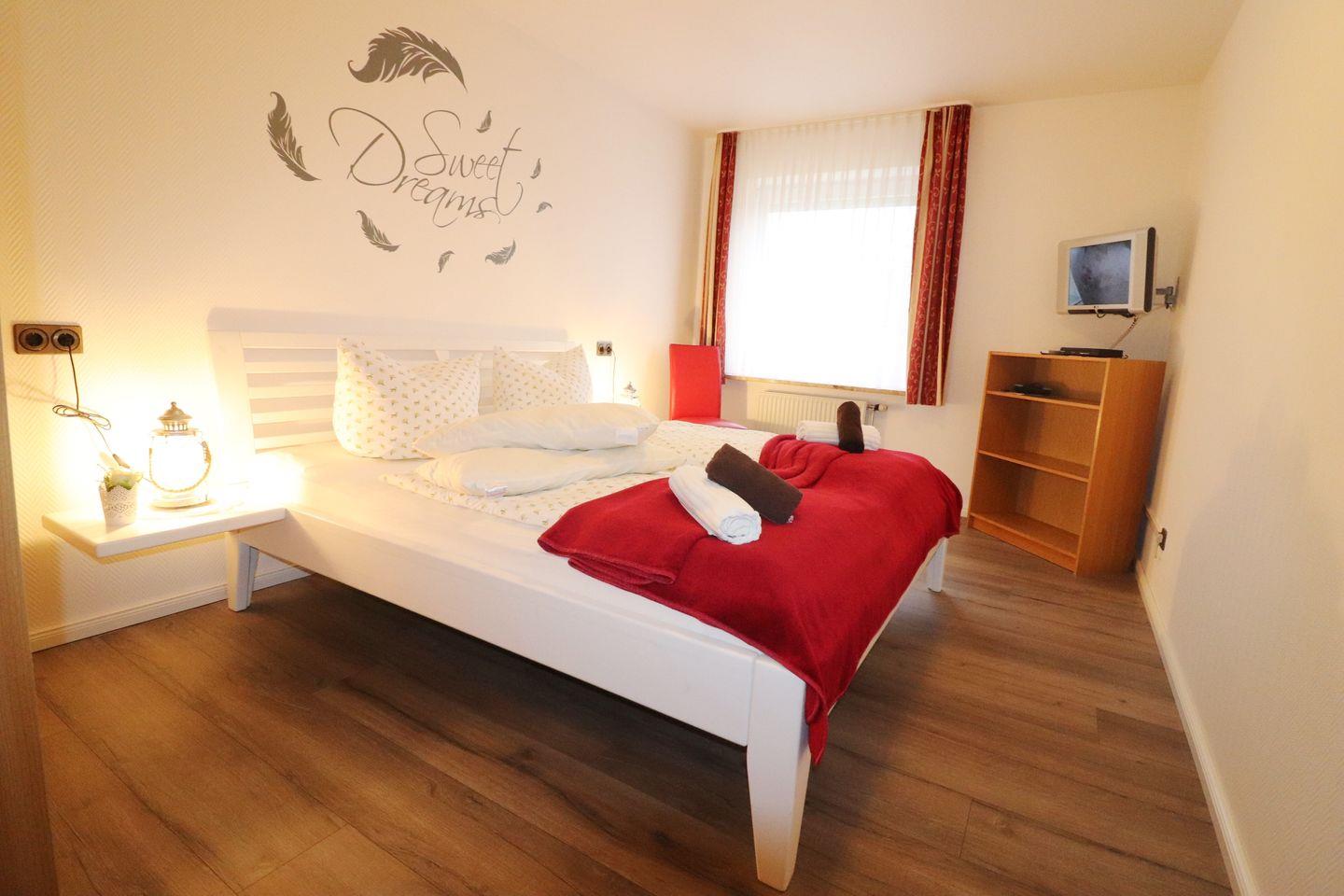 Die 2-Raum-Wohnung im 1. OG hat 54 m² und 1 Schlafzimmer (1 x Doppelbett). Die Wohnung hat eine separate Küche, 2x TV und ein Duschbad. Die Küche hat einen Wasserkocher, Kaffeemaschine, Toaster, Geschirrspüler, sowie Geschirr für den täglichen Bedarf sind ebenfalls vorhanden. Haustiere nach Absprache erlaubt.