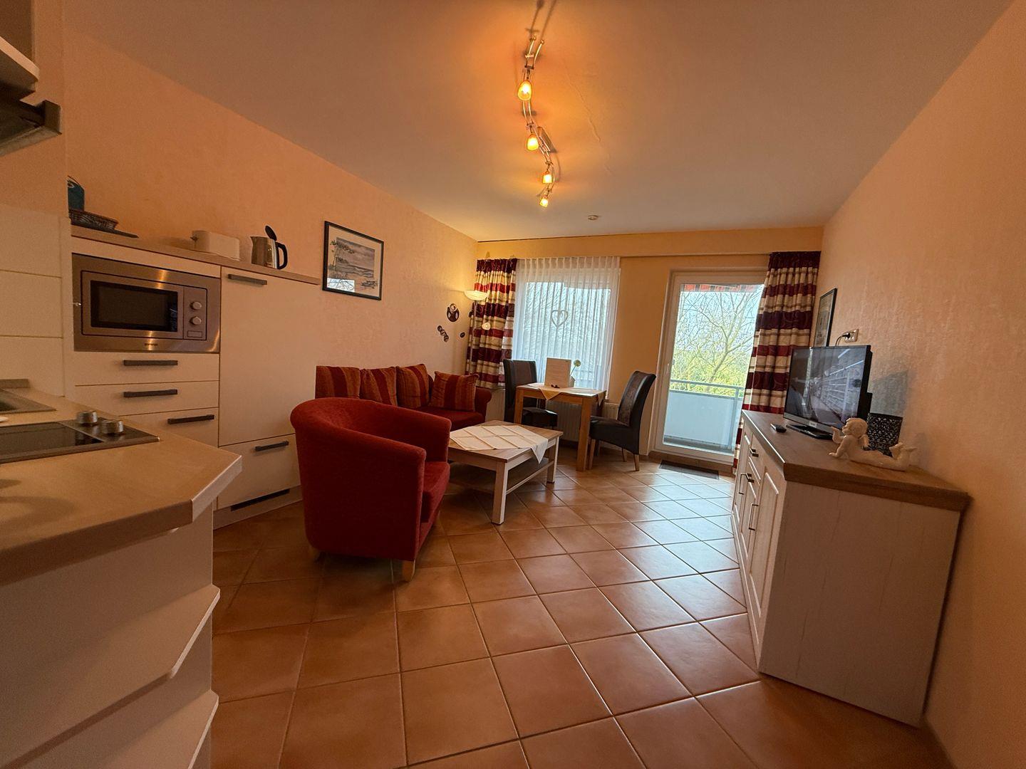 Das 2-Raum Appartement im 1. OG auf 35 m² hat 1 Schlafzimmer (2 x Einzelbett ), ein Wohnzimmer mit Balkon zur Seeseite (Süden) mit Blick in den Kurpark, eine neue Küche und separates Duschbad. Die Wohnung ist gemütlich eingerichtet. Die Pantryküche verfügt über einen Wasserkocher, Kaffeemaschine, Toaster, Geschirrspüler, sowie Geschirr für den täglichen Bedarf sind ebenfalls vorhanden. Haustiere sind nicht erlaubt.