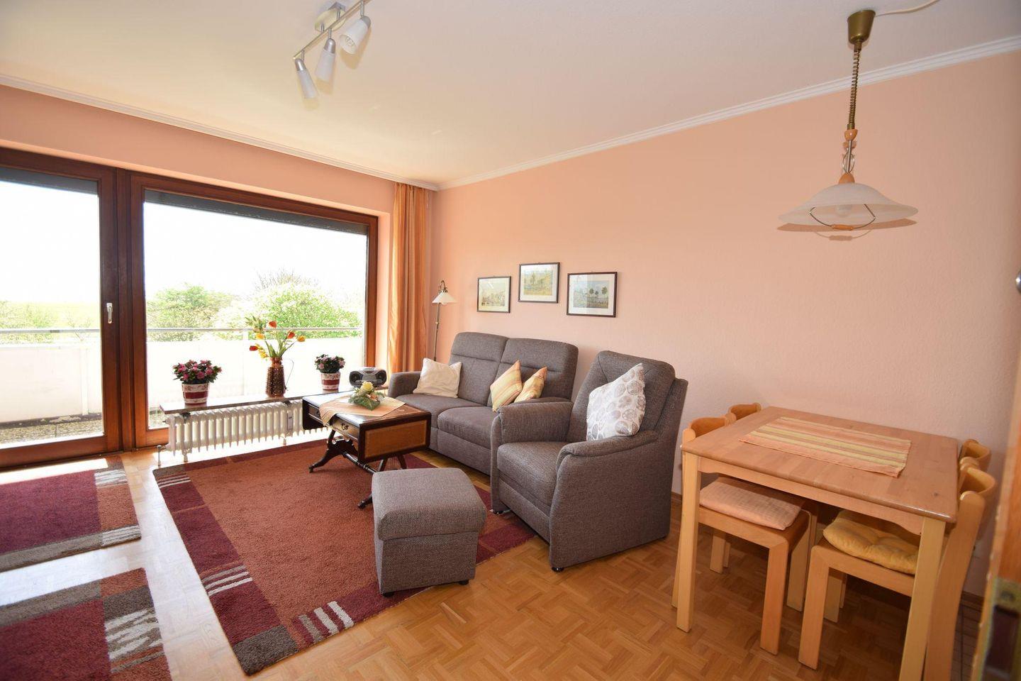Die Ferienwohnung Nr. 38 mit Meerblick im Haus Nordseeblick befindet sich im dritten Obergeschoss und verfügt über einen Balkon. Im Wohnzimmer finden Sie eine Couchgarnitur mit einem Sessel und Hocker vor. Die Küche und der Essbereich sind im Wohnbereich integriert. Das Schlafzimmer ist mit einem Doppelbett ausgestattet. Das Bad verfügt über eine Dusche/WC. Vom Wohnzimmer aus gelangt man auf den in Südwestlage liegenden Balkon. Im Keller befinden sich eine Waschmaschine und ein Trockner (gebührenpflichtig) sowie ein Abstellraum für Fahrräder. Fährräder können auch vor dem Haus im Fahrradständer abgestellt werden. Das Haus verfügt über einen Aufzug.