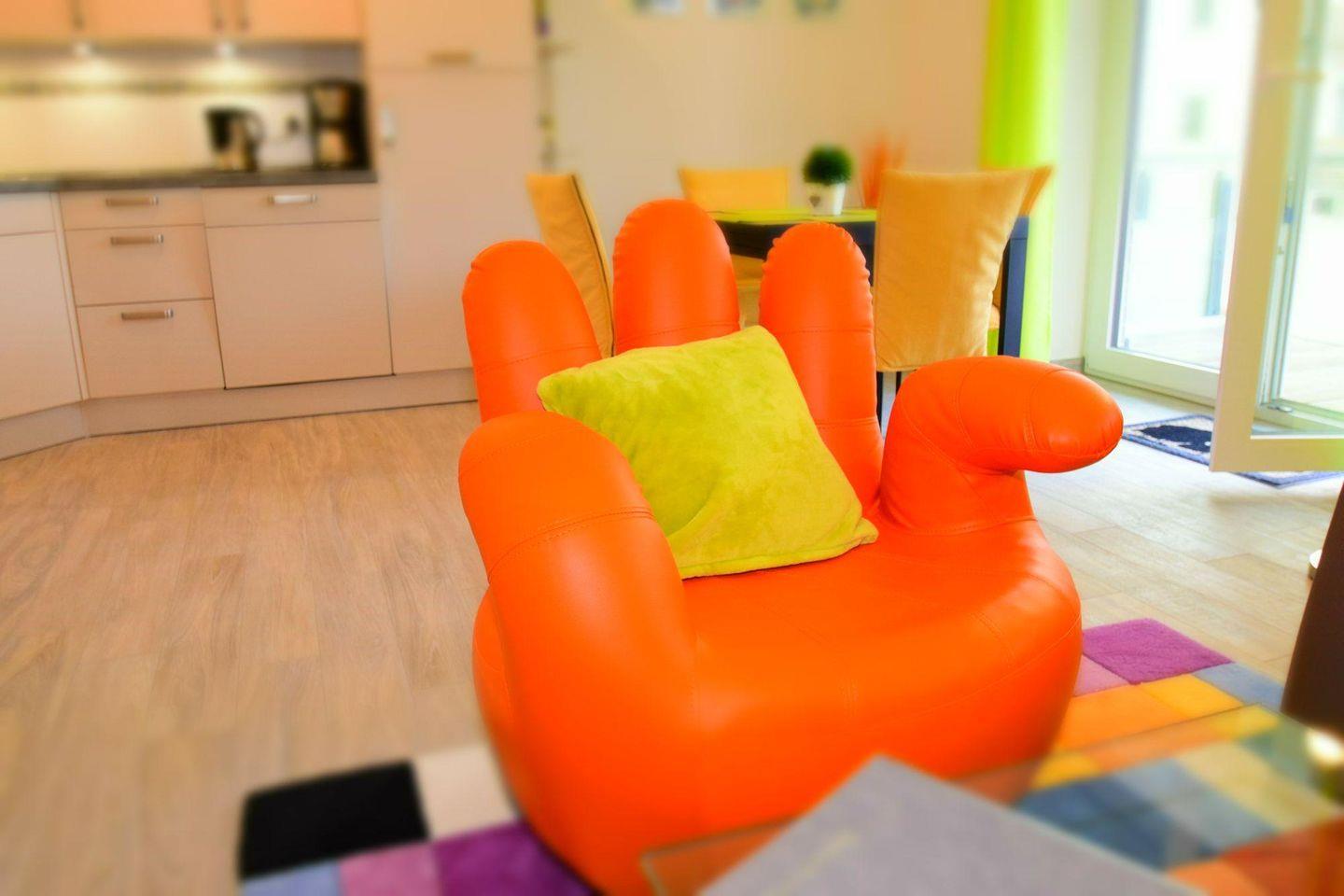 Die Ferienwohnung 1.6 ist eine moderne 2-Raum-Wohnung mit Balkon. Die Küchenzeile und der Essbereich sind direkt im Wohnbereich integriert. Das Bad verfügt über eine ebenerdige Dusche, WC, Handtuchtrockner und Haar-Föhn. Vom Wohnbereich gelangen Sie direkt auf den Balkon.