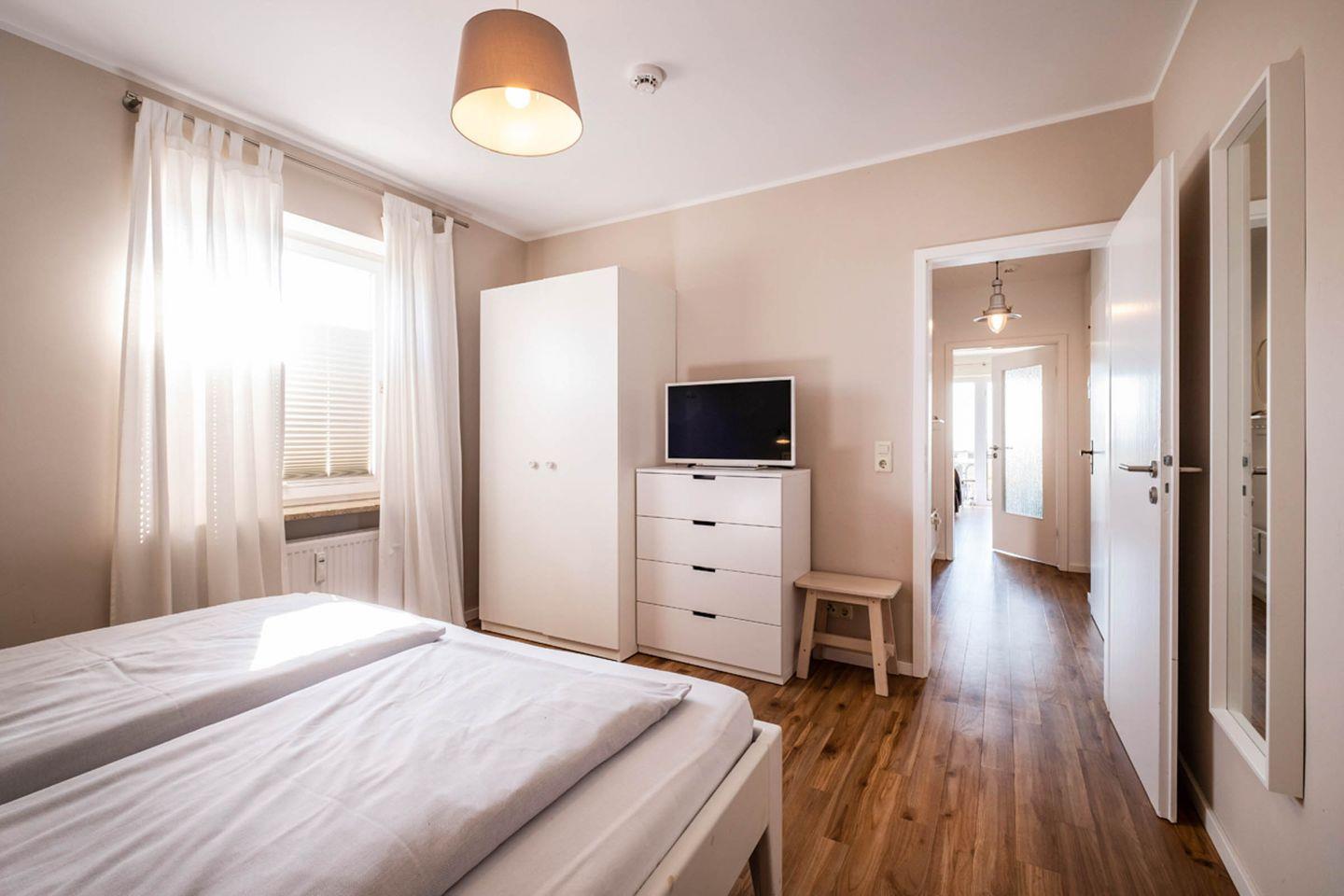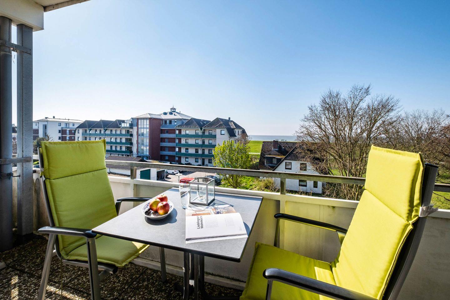 Die Ferienwohnung Nr. 31 mit Meerblick im Haus Nordseeblick befindet sich im III. Obergeschoss und verfügt über einen Balkon. Die Wohnung wurde Anfang 2017 komplett renoviert. Im Wohnzimmer finden Sie eine gemütliche Couchgarnitur vor. Die Küche und der Essbereich sind im Wohnbereich integriert. Das Schlafzimmer ist mit einem Doppelbett und TV ausgestattet. Das Tageslicht-Bad verfügt über eine Dusche/WC. Vom Wohnzimmer aus gelangt man auf den in Südwestlage liegenden Balkon. Im Keller befinden sich eine Waschmaschine und ein Trockner (gebührenpflichtig) sowie ein Abstellraum für Fahrräder. Fährräder können auch vor dem Haus im Fahrradständer abgestellt werden. Das Haus verfügt über einen Aufzug.