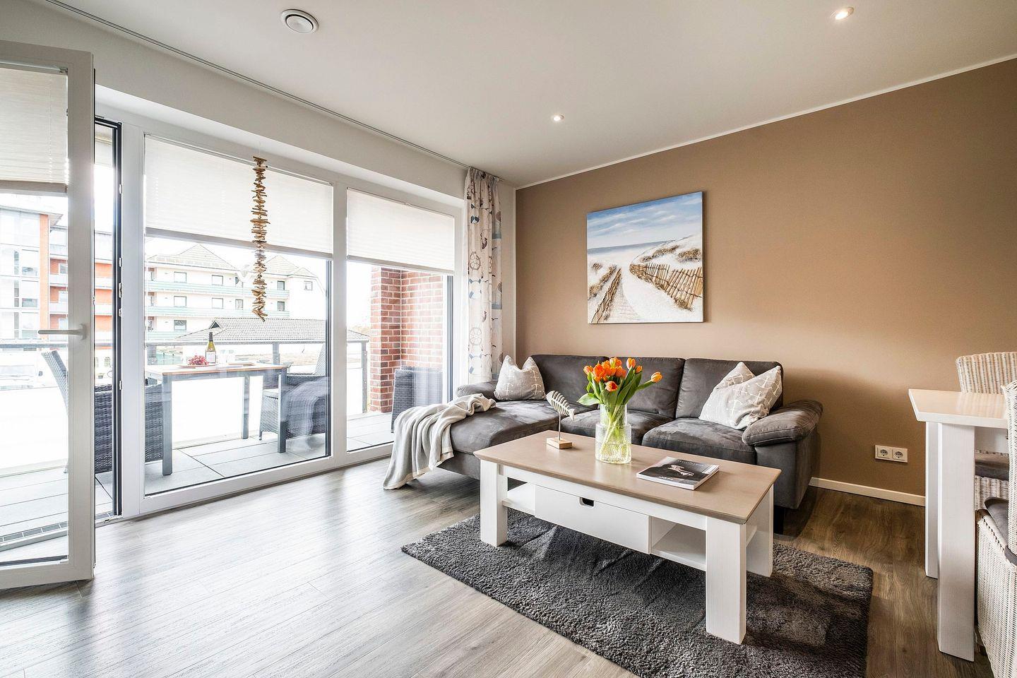 Nun gönnen Sie sich einen Schluck "Flaute" oder "Sturm" (Mineralwasser) & einen Happen "Marzipansprotten" und lassen Sie das maritim eingerichtete Wohnzimmer mit dem gemütlichen Sofa, der Schrankwand mit internetfähigem Fernseher, Blu-ray Player und HiFi-Anlage, der Essecke mit den bequemen Rattanstühlen und der offenen Kombüse mit den hochwertigen und zahlreichen Elektrogeräten sowie dem Blick auf das Bild „Nordsee“ auf sich wirken.