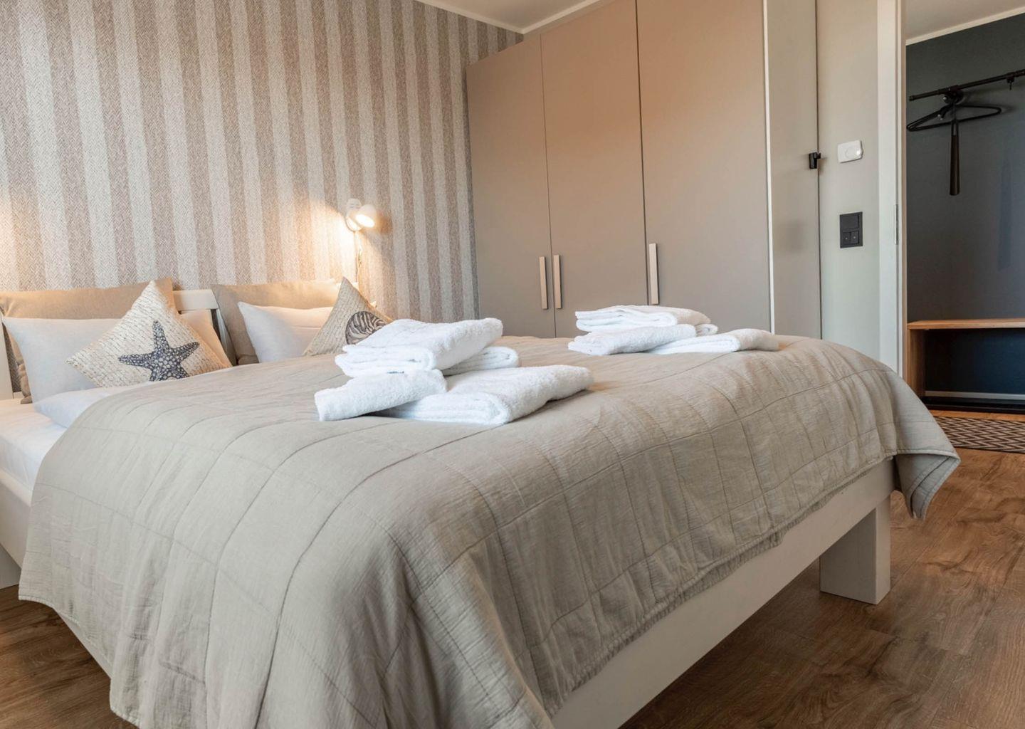 Schlafzimmer: 2x, mit Doppelbetten´, Leselampen mit Dimm-Funktion, Wandgarderobe und Kleiderschrank, TV-Gerät mit Flachbildschirm und Wandhalterung, Safe