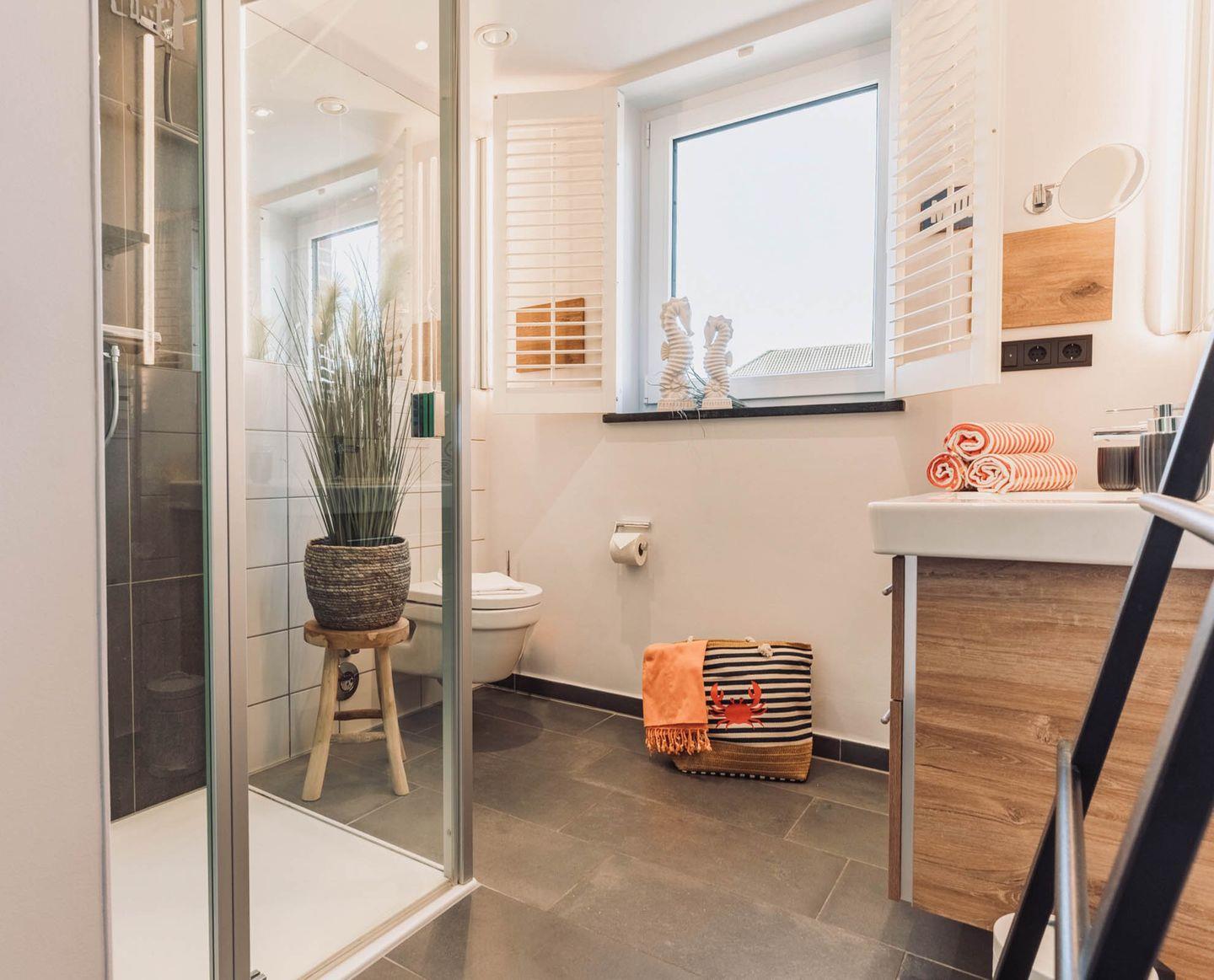 Sanitär: 1 Duschbad, barrierefrei und ebenerdig, mit Fenster, Handtuchheizung, Haar-Föhn, Kosmetikspiegel, 1 Gäste-WC extra.