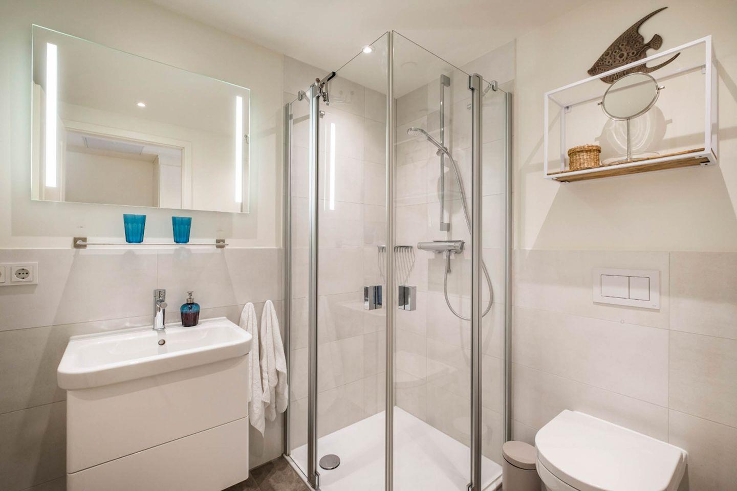 Sanitär: 2 komplette Duschbäder, je mit Handtuchheizung, je ein Haar-Föhn pro Duschbad, Kosmetikspiegel