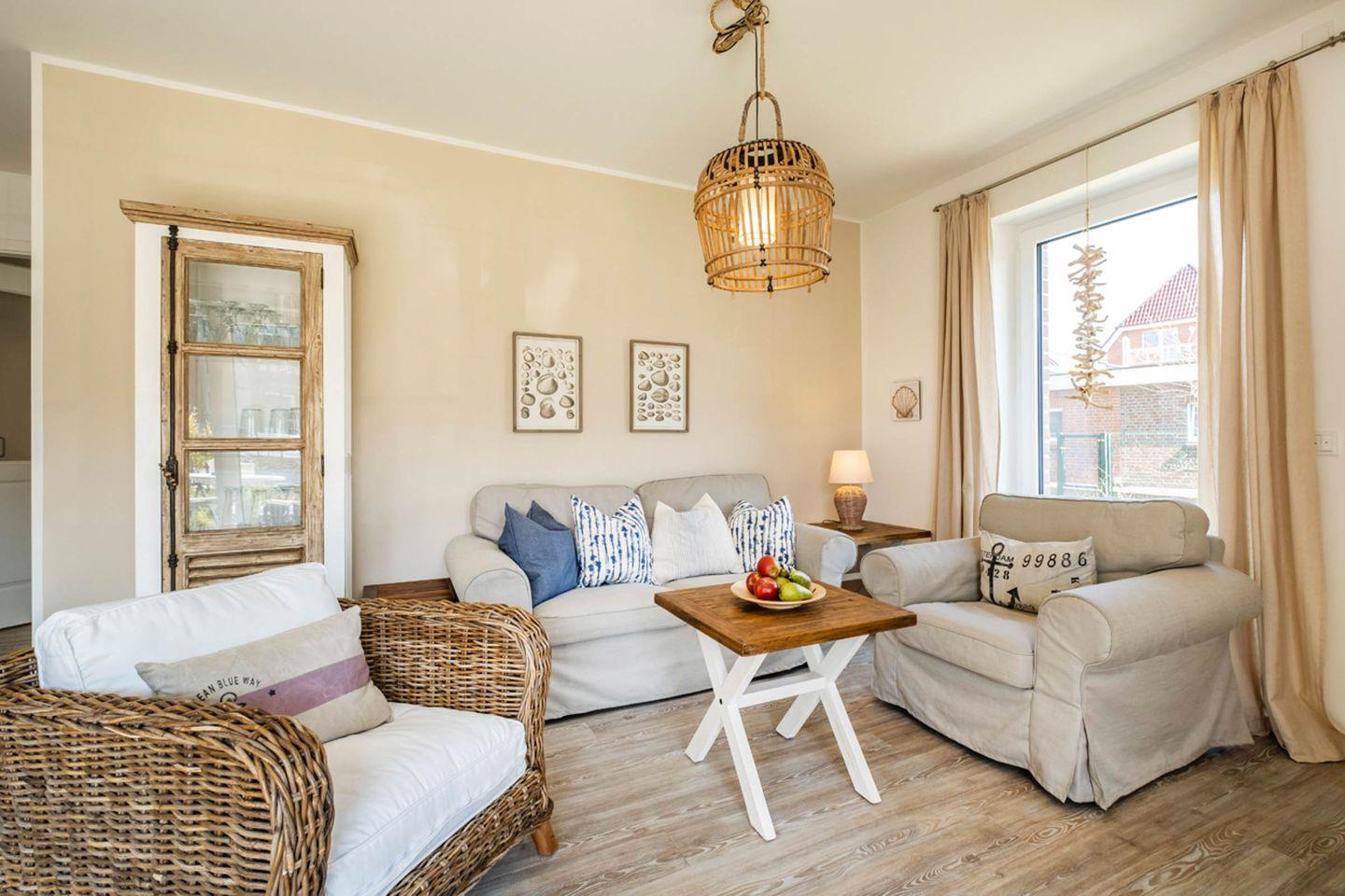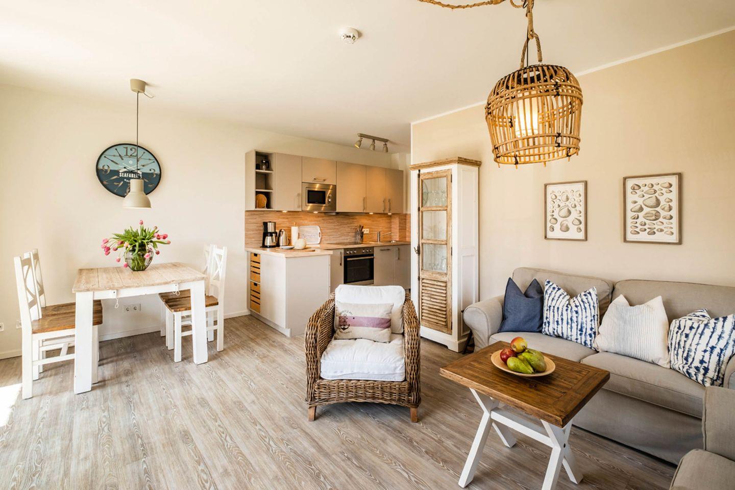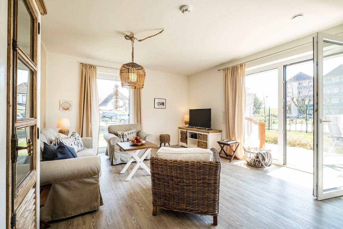 Das Appartement 0.6 befindet sich im Erdgeschoss und verfügt über eine Terrasse. Die Wohnung hat 2 Schlafzimmer, jeweils mit Doppelbett und Fernsehgerät ausgestattet. Eins der Schlafzimmer hat ein Duschbad en-Suite, das andere Duschbad ist vom Flur aus zu erreichen. Das Wohnzimmer mit Küchenzeile und Essbereich ist gemütlich im Landhausstil eingerichtet und lädt zum Verweilen und Relaxen ein.