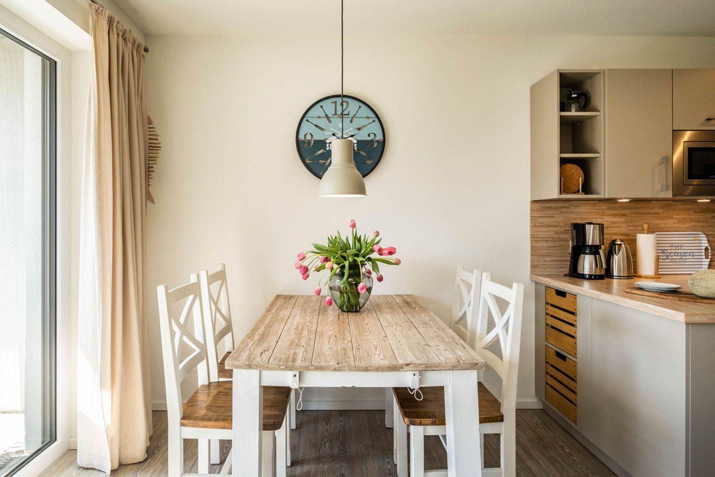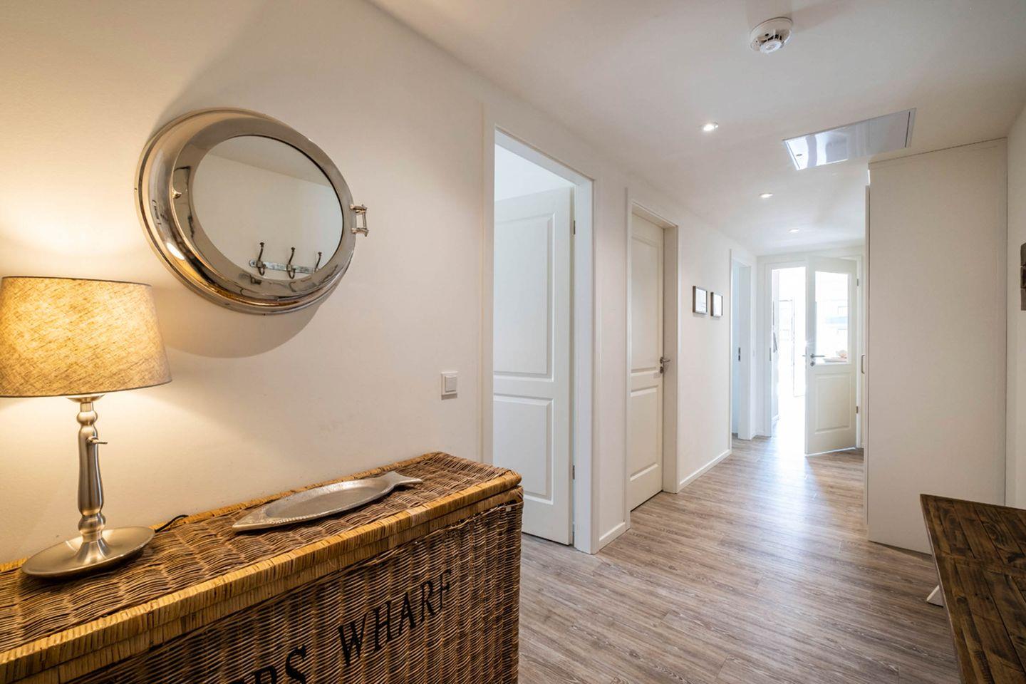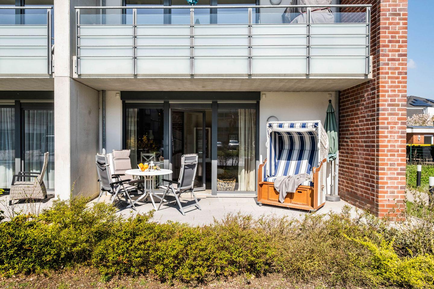 Das Appartement 0.6 befindet sich im Erdgeschoss und verfügt über eine Terrasse. Die Wohnung hat 2 Schlafzimmer, jeweils mit Doppelbett und Fernsehgerät ausgestattet. Eins der Schlafzimmer hat ein Duschbad en-Suite, das andere Duschbad ist vom Flur aus zu erreichen. Das Wohnzimmer mit Küchenzeile und Essbereich ist gemütlich im Landhausstil eingerichtet und lädt zum Verweilen und Relaxen ein.