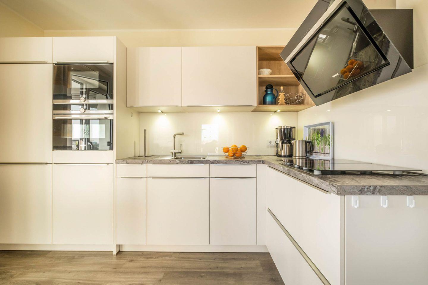 Küche: Backofen, Cerankochfeld, Mikrowelle, Geschirrspüler, Kühl- Gefrierkombination, Kaffeemaschine, Wasserkocher, Toaster