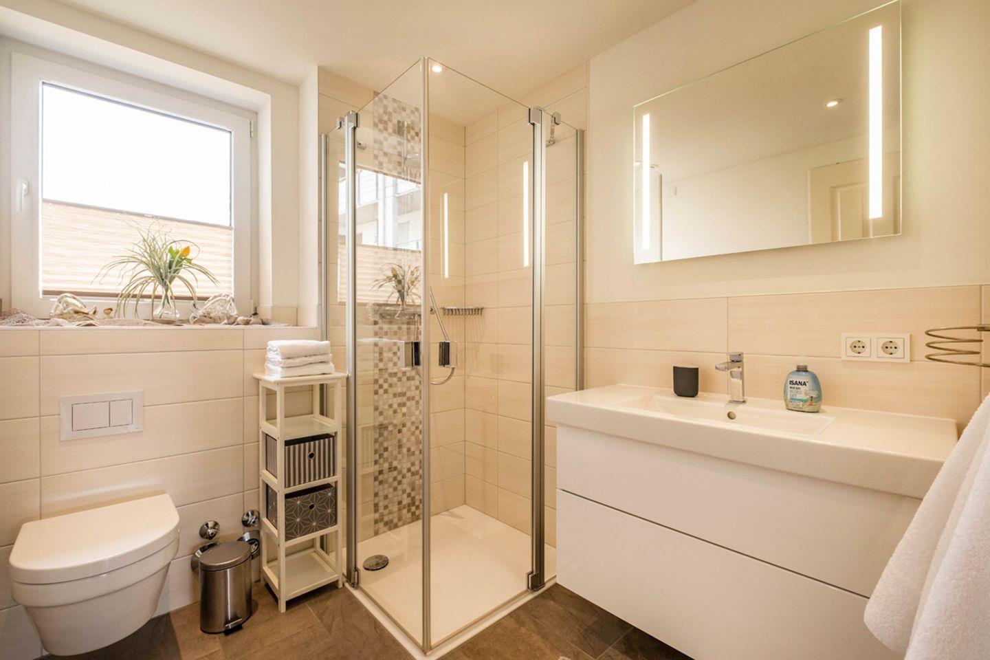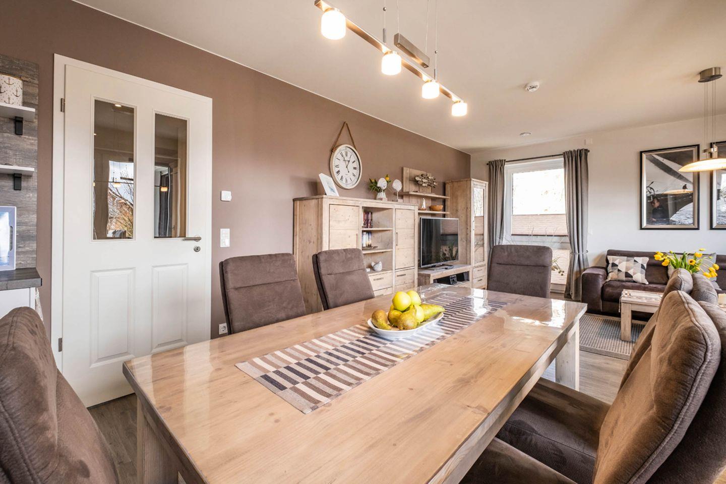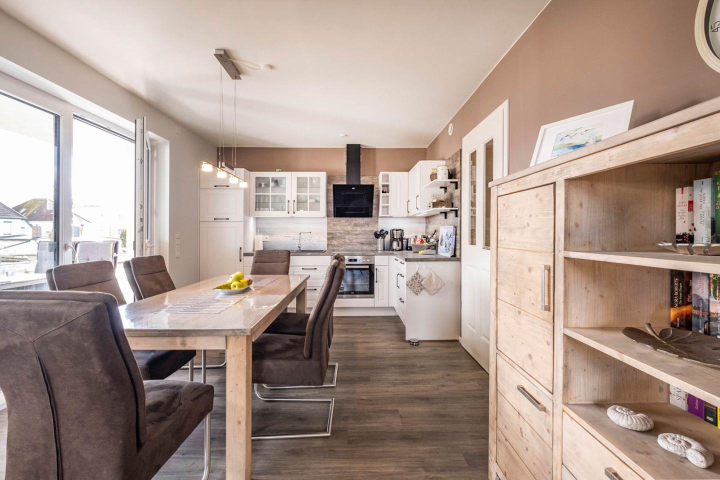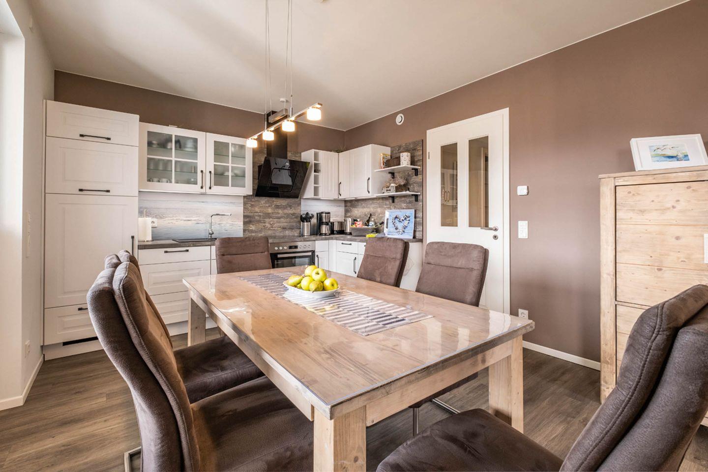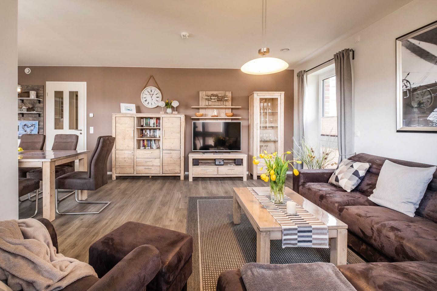Das Wohnzimmer ist mit seinen warmen Farben, dem Ecksofa und dem Sessel mit Fußhocker sehr gemütlich und lädt zum Verweilen ein. Ein Duschbad und ein Gäste-WC befinden sich im Appartement. Die Küche im Landhausstil ist mit allen denkbaren Details ausgestattet.