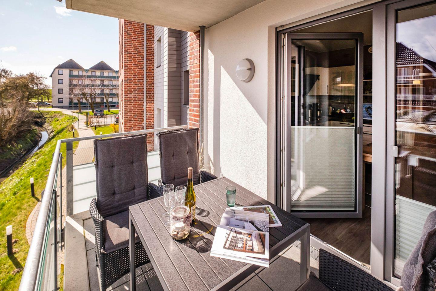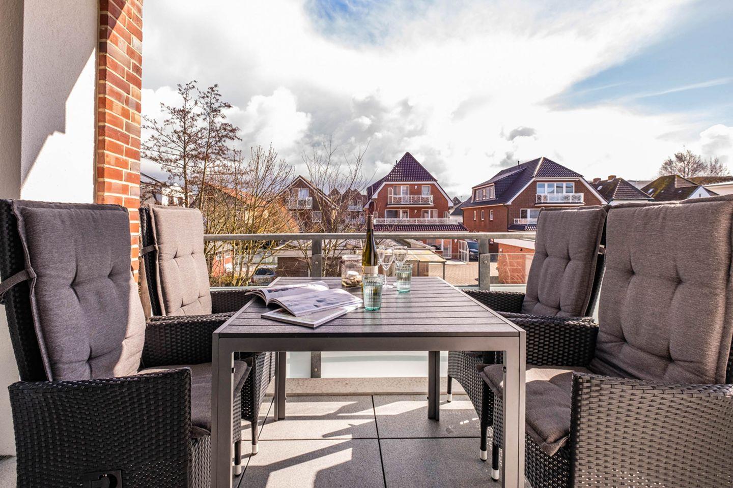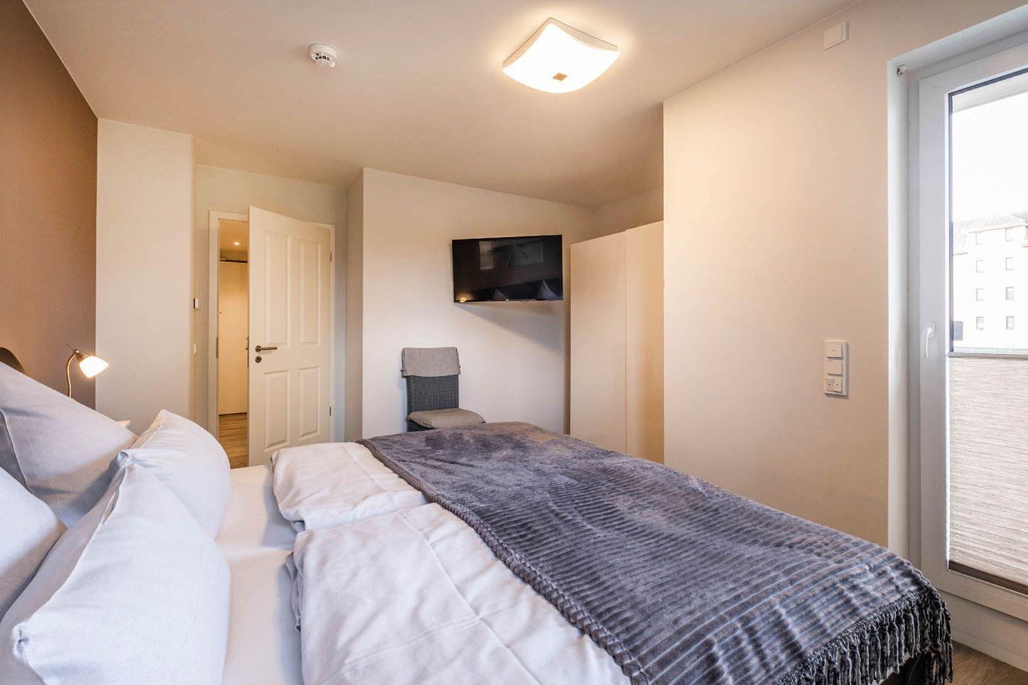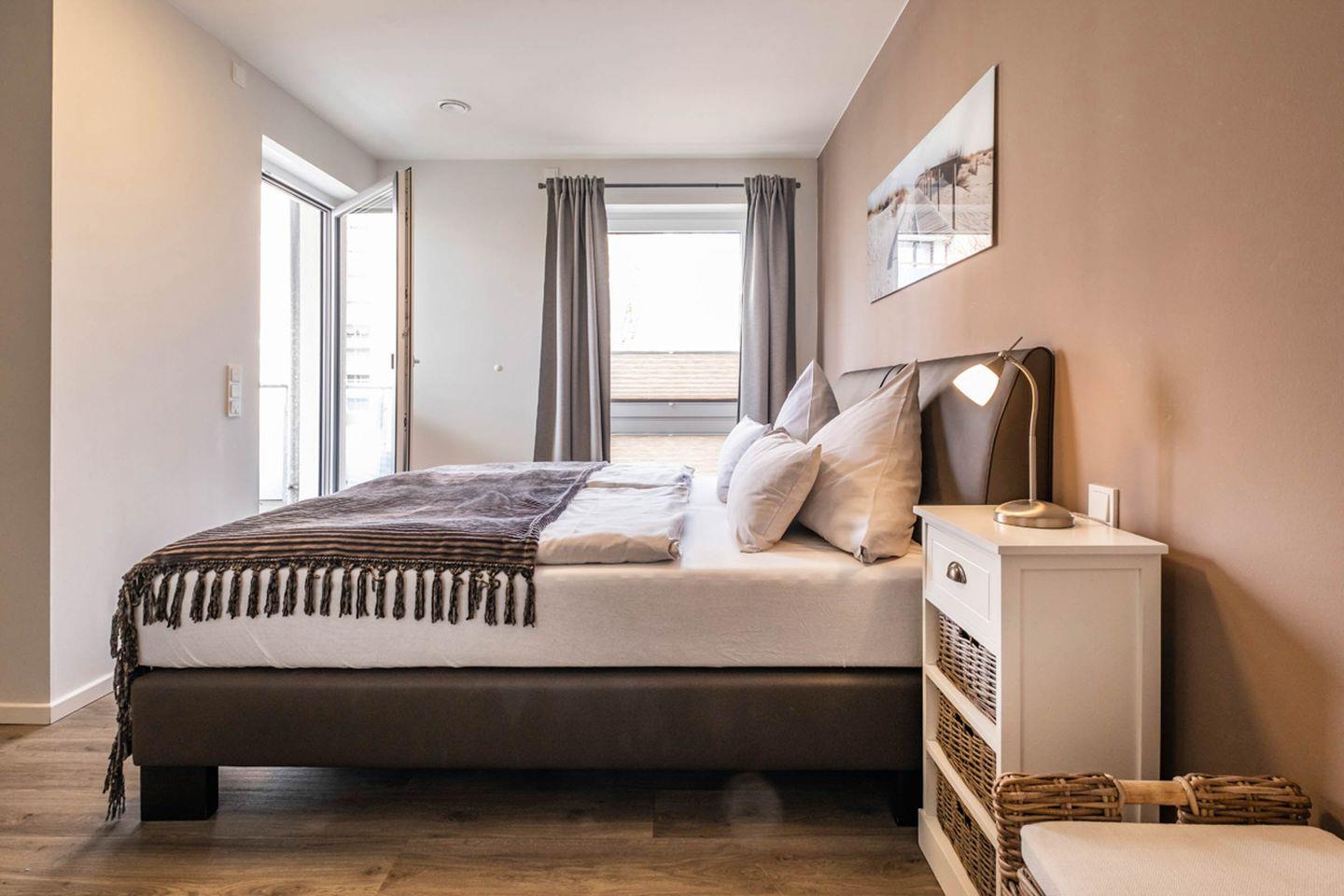 Das Appartement 1.7 (Strand-Idylle) befindet sich im I. Obergeschoss und verfügt über zwei Balkone: einen im Wohnzimmer, den anderen in einem der Schlafzimmer. Insgesamt hat die Wohnung zwei Schlafzimmer.