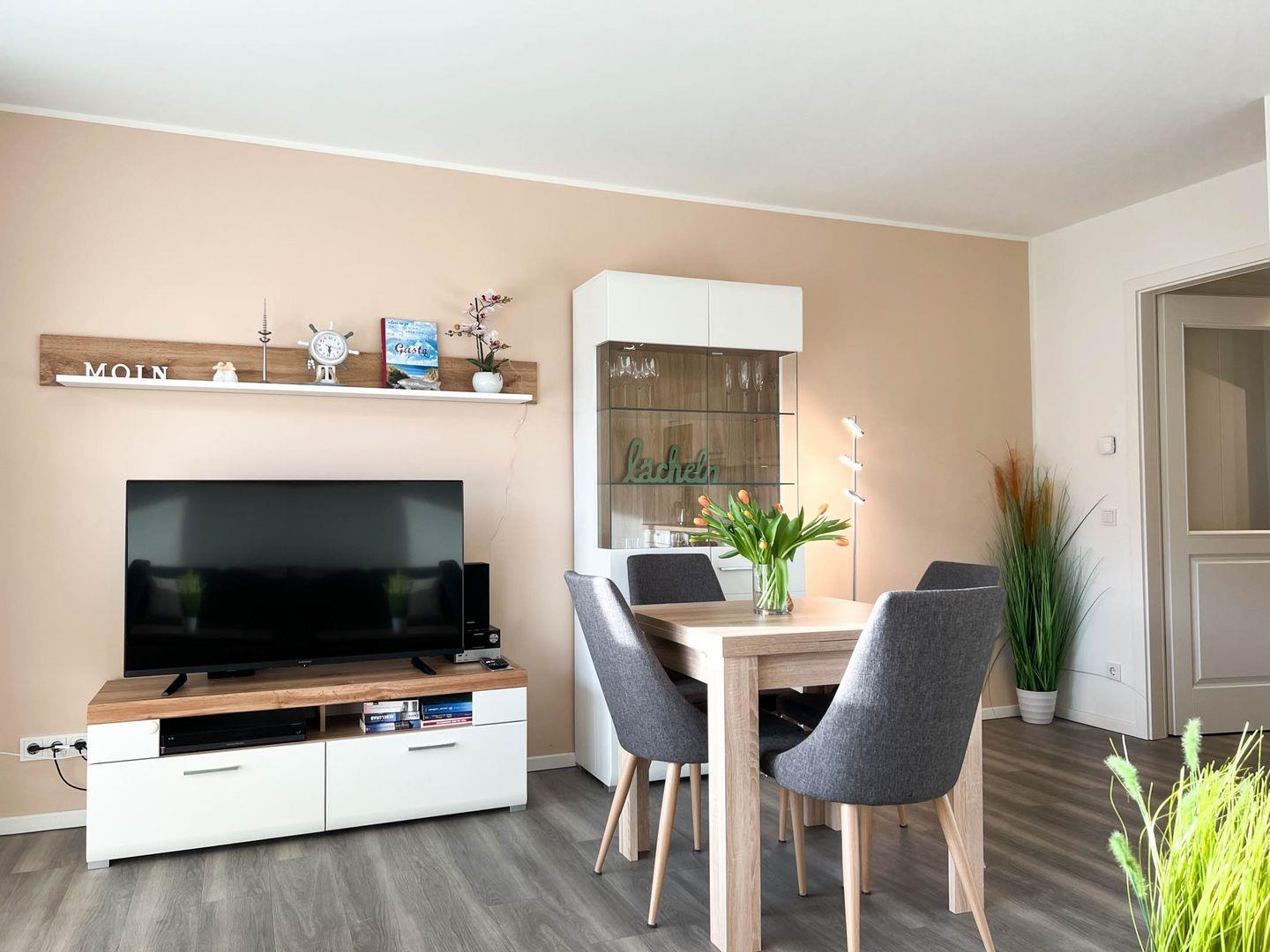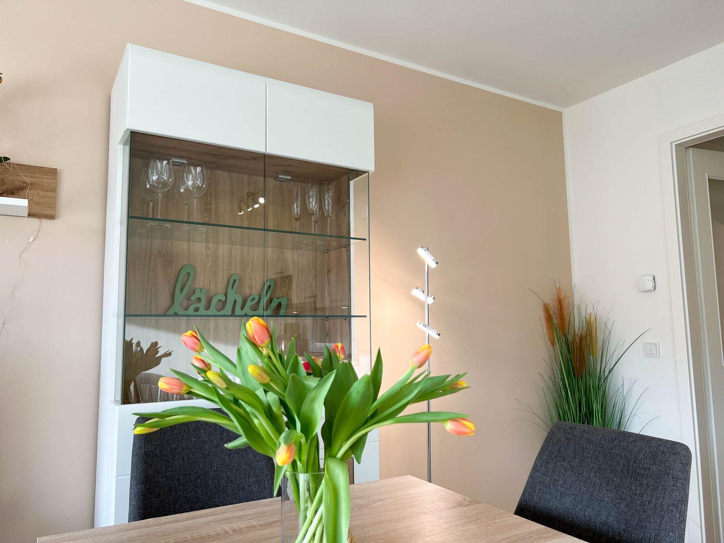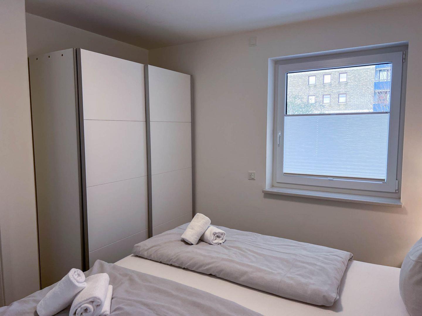 Das Appartement 1.2 befindet sich im I. Obergeschoss und verfügt über einen Balkon mit Markise. Die Wohnung ist sehr schön vom Eigentümer eingerichtet worden und verfügt im Wohnzimmer über ein Schlafsofa mit einer Liegefläche von 150x200 cm, inklusive Matratze. Das Boxspringbett in Komforthöhe im Schlafzimmer misst 180x200 cm. Dem Appartement ist ein PKW- Stellplatz direkt am Haus zugehörig. Fahrradraum, abschließbar.