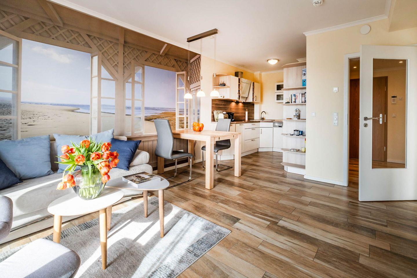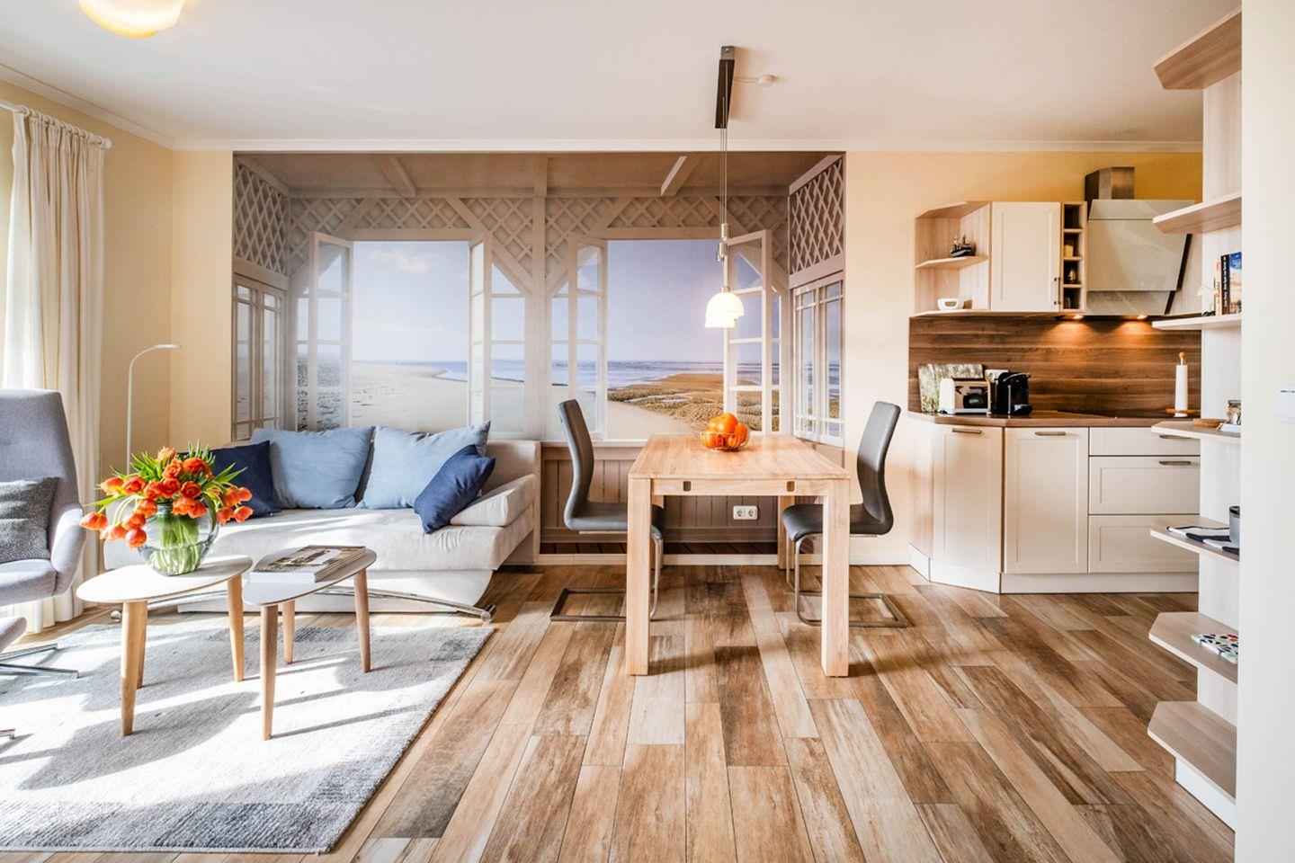 Das Haus Hafenresidenz Apartment 1.3 in Büsum bietet auf 52 m² ein komfortables Wohnzimmer mit offen integrierter Küche, ein separates Schlafzimmer sowie einen Balkon. Ausgestattet mit WLAN, zwei TVs, moderner Fußbodenheizung und Gemeinschaftsnutzung von Waschmaschine und Trockner eignet sich das Nichtraucher-Apartment für bis zu zwei Gäste. Strand, Einkaufsmöglichkeiten und Restaurants sind nur 250 m entfernt.