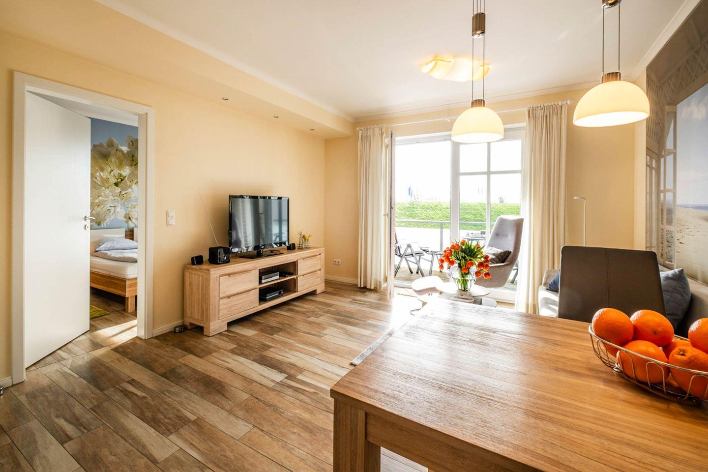 Das Appartement 1.3 mit Balkon liegt im ersten Obergeschoss des Hauses Hafenresidenz. Im Wohnzimmer finden Sie ein gemütliches Schlafsofa vor. Die Küche und der Essbereich sind im Wohnbereich integriert. Das Schlafzimmer ist mit einen Doppelbett und TV-Wandmontage ausgestattet. Das geräumige Duschbad verfügt über eine Regendusche, einen Handtuchtrockner und einen Haltegriff in der Dusche. Die Dusche hat eine niedrige Einstiegskante. Fußbodenheizung im ganzen Appartement. Vom Wohnzimmer gelangen Sie auf den Balkon, der in Südwestlage, mit Blick auf den Gründeich und Schiffe im Trockendock, liegt. Das Appartement verfügt über elektrische Außenjalousien und über eine Gegensprechanlage mit Kamera. Im Erdgeschoß des Hauses finden Sie Waschmaschine und Trockner (gebührenpflichtig) und einen Abstellraum für Fahrräder. Das Haus verfügt über einen Aufzug.