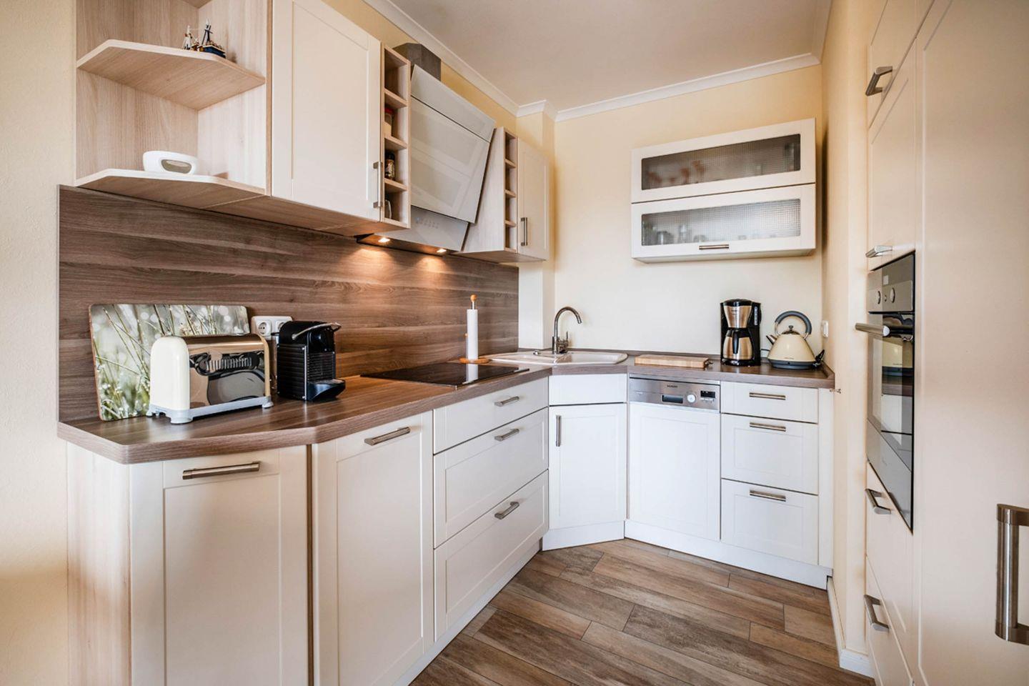Küche: Backofen in Komforthöhe, Herd mit Cerankochfeld (Induktion), Mikrowelle, Geschirrspüler, Kühlschrank mit Gefrierfach, Kaffeemaschine, Eierkocher