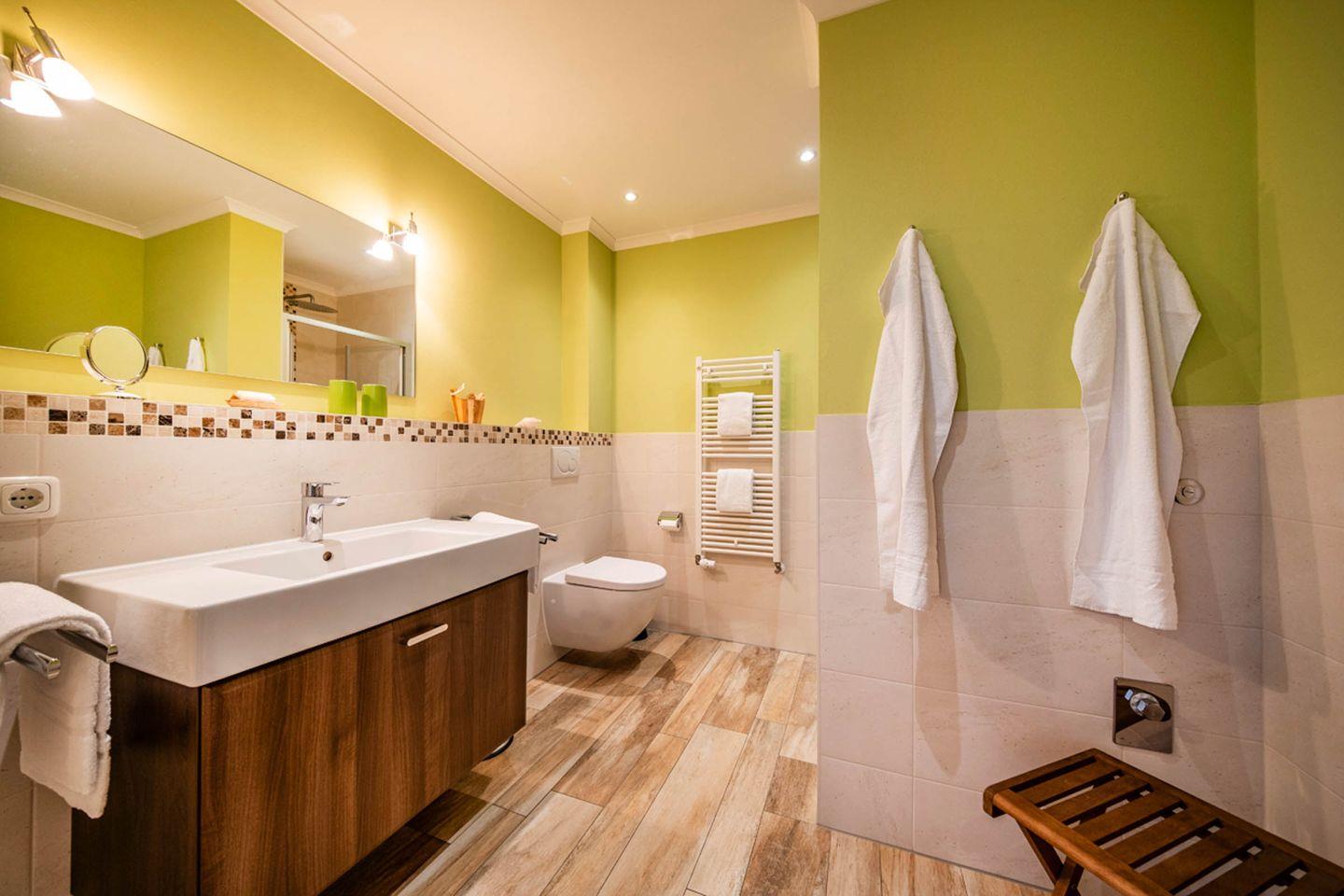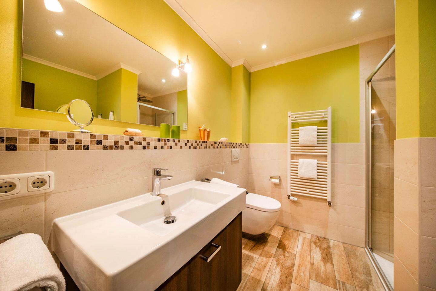 Sanitär: Duschbad, Handtuchtrockner, Föhn, Regendusche