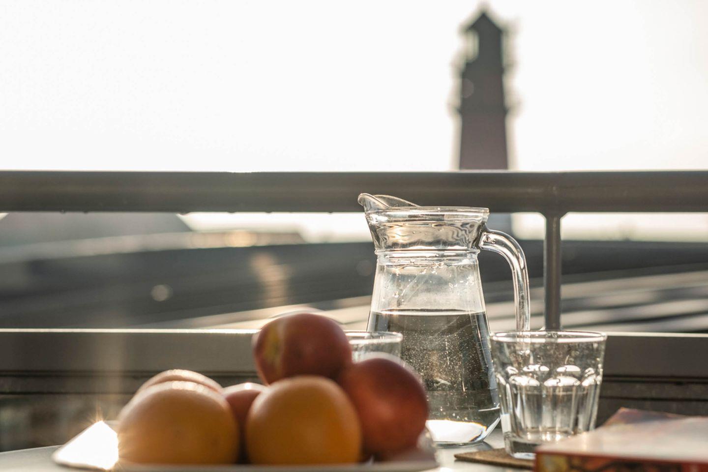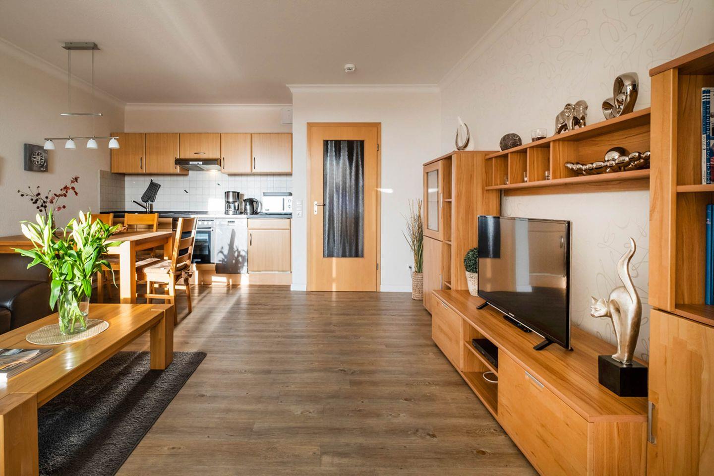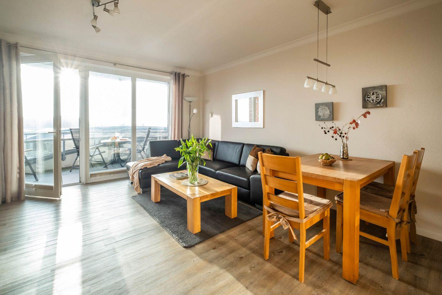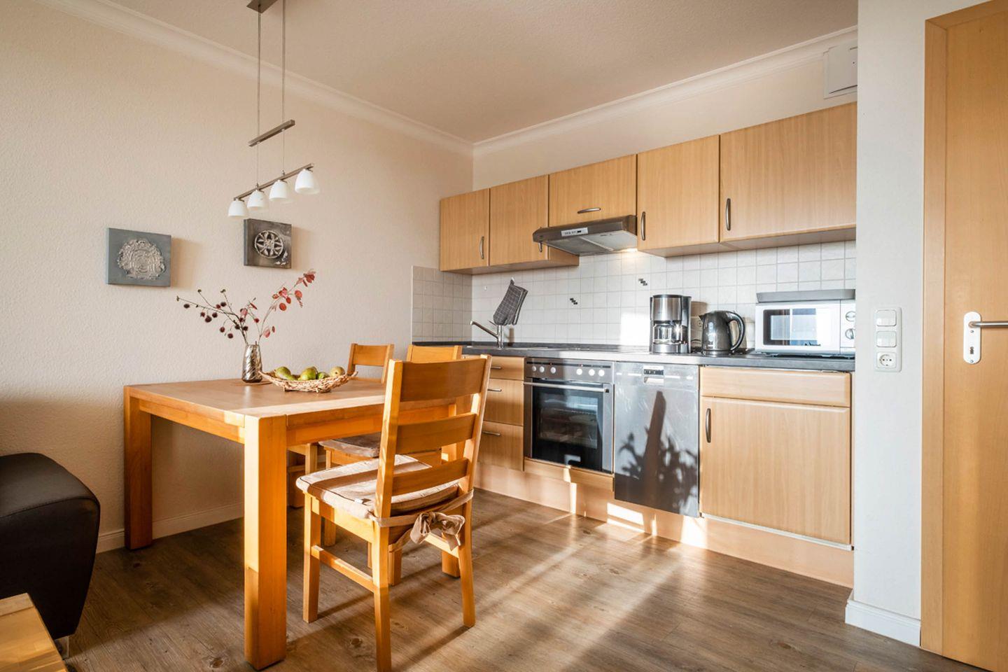 Die Ferienwohnung 2.5 ist eine 2-Raum-Wohnung mit Balkon in Südwest-Lage und Blick auf den Hafen. Die Küchenzeile und der Essbereich sind direkt im Wohnbereich integriert. Das Bad verfügt über eine Dusche, WC, Handtuchtrockner und Haar-Föhn. Vom Wohnbereich gelangen Sie direkt auf den Balkon.