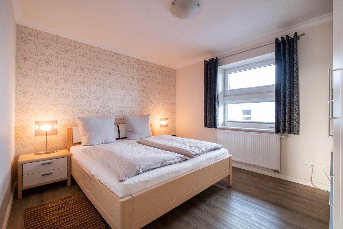 Das Schlafzimmer ist mit einem Doppelbett ausgestattet und verfügt über einen Wandmontage-Fernseher. Alle unsere Ferienappartements sind Nichtraucher-Appartements.