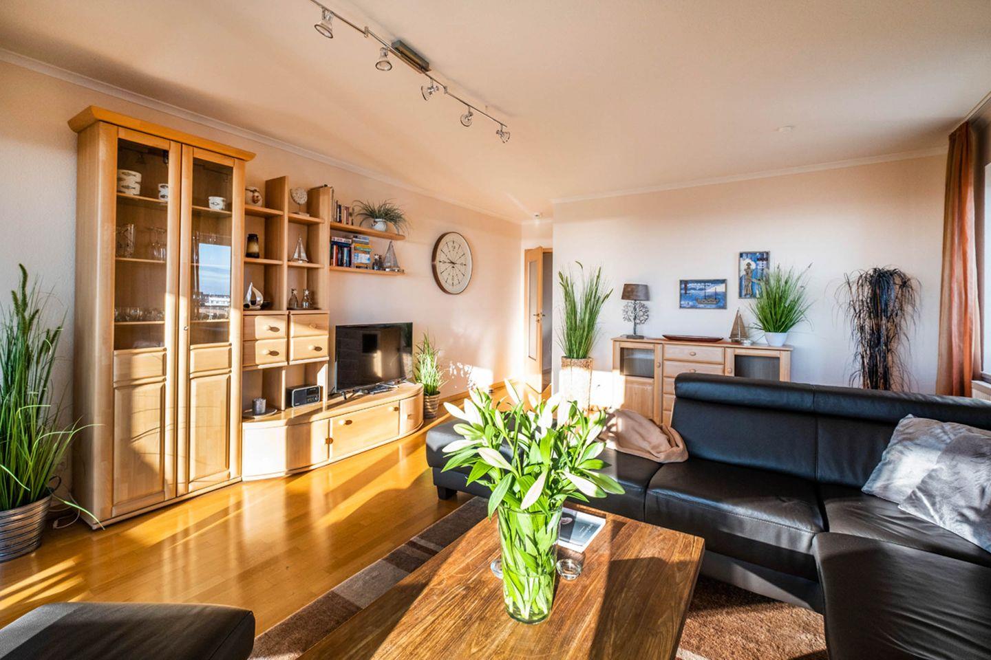 Die Ferienwohnung 3.1 ist eine großzügige 3-Raum-Wohnung mit 2 Balkonen in Südwest-Lage (einer vom Wohnzimmer und einer von einem der Schlafzimmer) und Blick auf den Hafen. Die Küche ist separat mit Essbereich. Das Bad verfügt über eine Dusche mit geringem Einstieg, WC, Handtuchtrockner und Haar-Föhn. Vom Wohnbereich gelangen Sie direkt auf den Balkon.