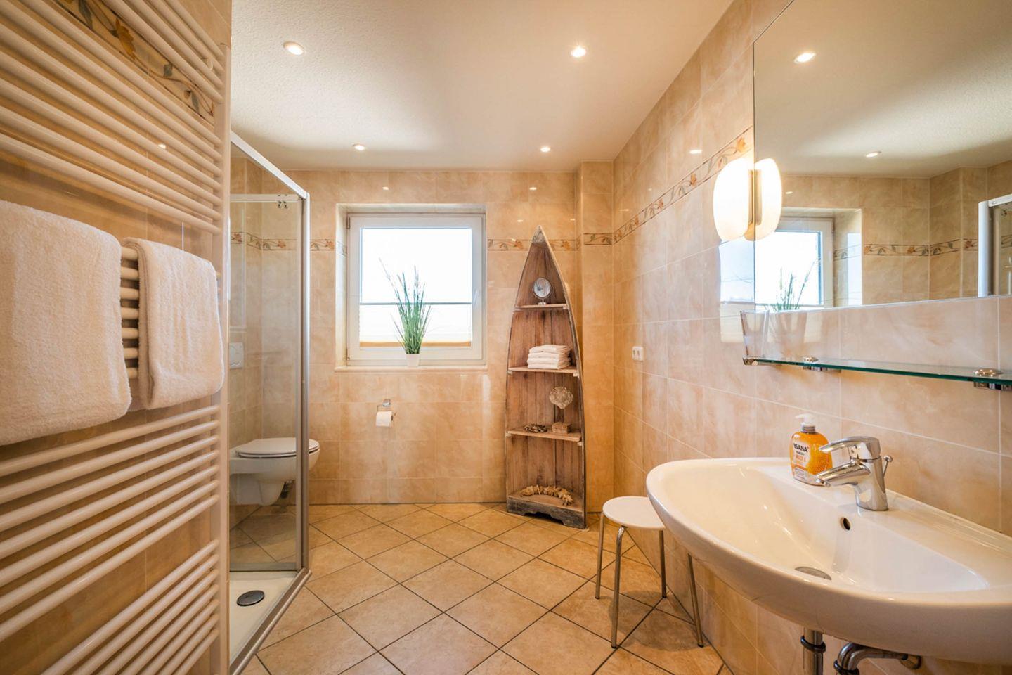 Sanitär: Duschbad mit Dusche (geringe Einstiegshöhe), Haar-Föhn, Kosmetikspiegel, Gäste-WC