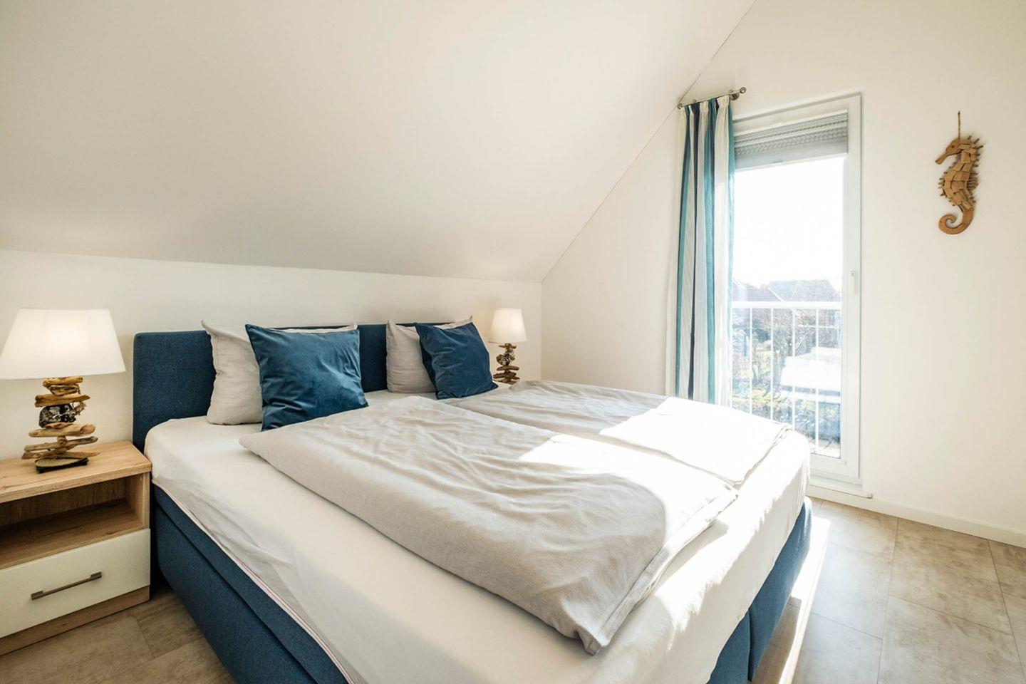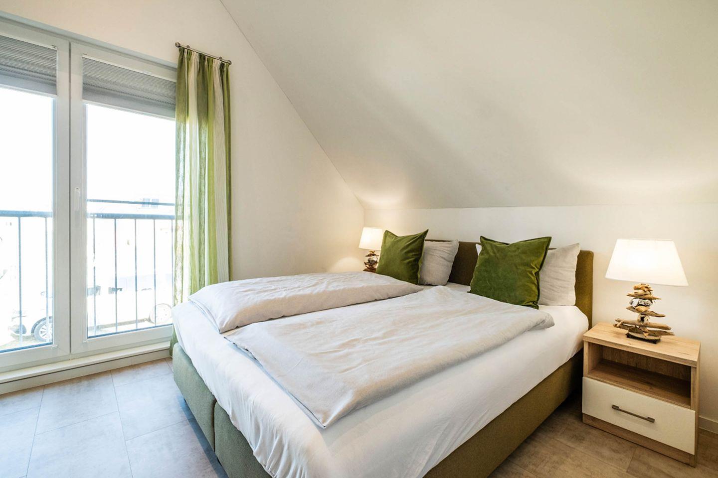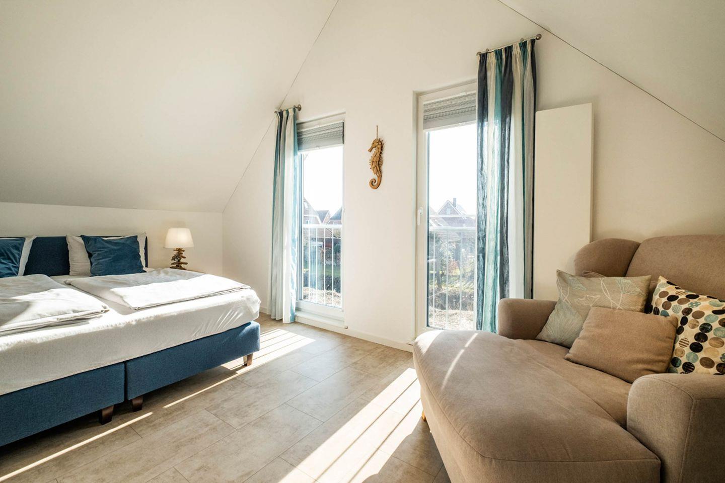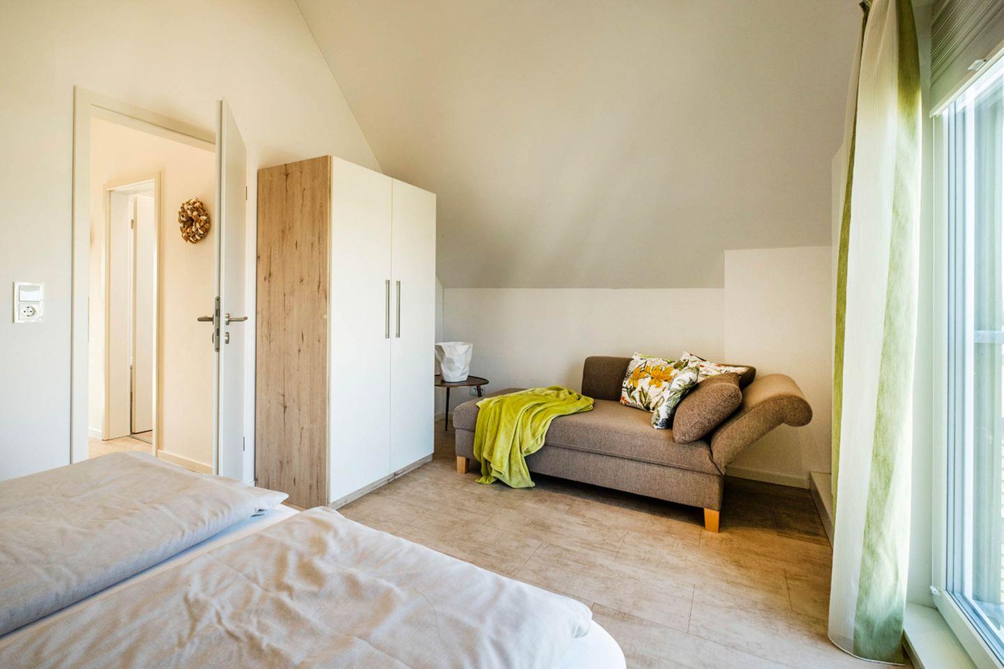 Über die Treppe gelangen Sie ins Obergeschoß mit 2 Schlafzimmern und einem Bad mit Badewanne. Das eine Schlafzimmer ist mit einem Boxspringbett (180x200), TV und einem großen, gemütlichen Sessel ausgestattet. In dem anderen Schlafzimmer befindet sich ein Boxspringbett (160x200) sowie eine Récamiere mit Schlaffunktion.