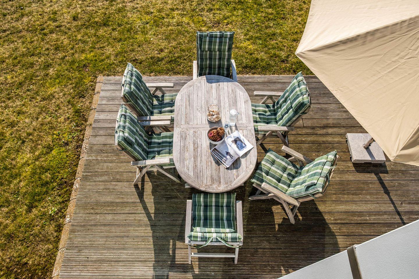 Der lichtdurchflutete Wohn-Essbereich lädt mit gemütlicher Sitzecke und Kamin zum Lesen, Fernsehen oder Spielen an dem großen (ausziehbaren) Esstisch ein. Von hier gelangen Sie auch auf die Südterrasse, ausgestattet mit Sonnenschirm und gemütlichen Sitzmöbeln und direktem Zugang zum Garten.