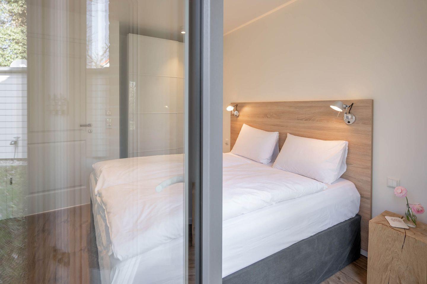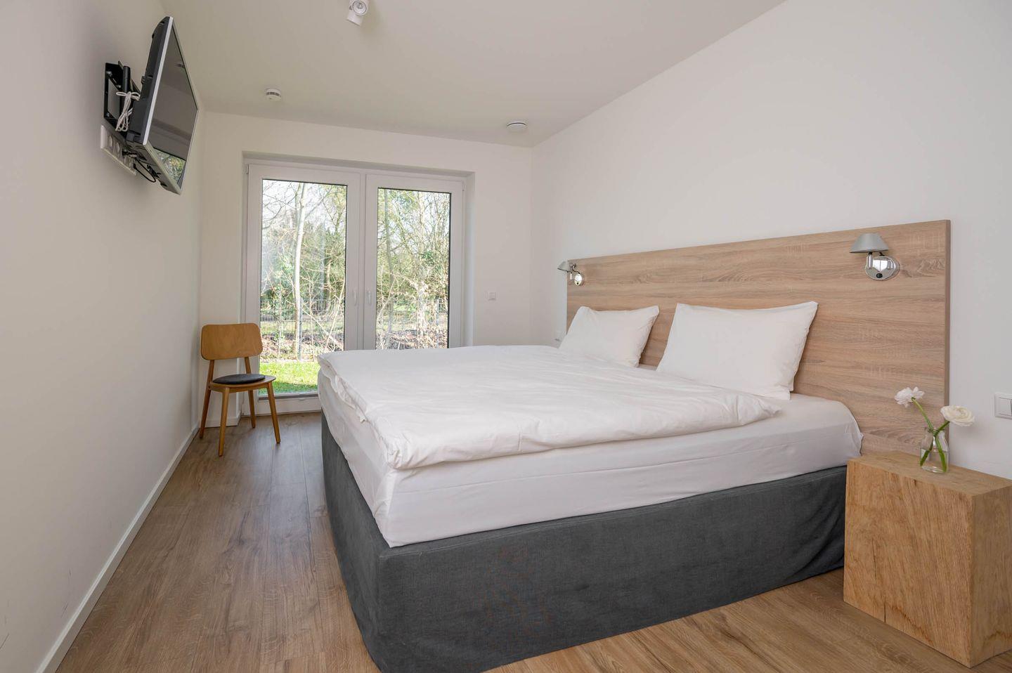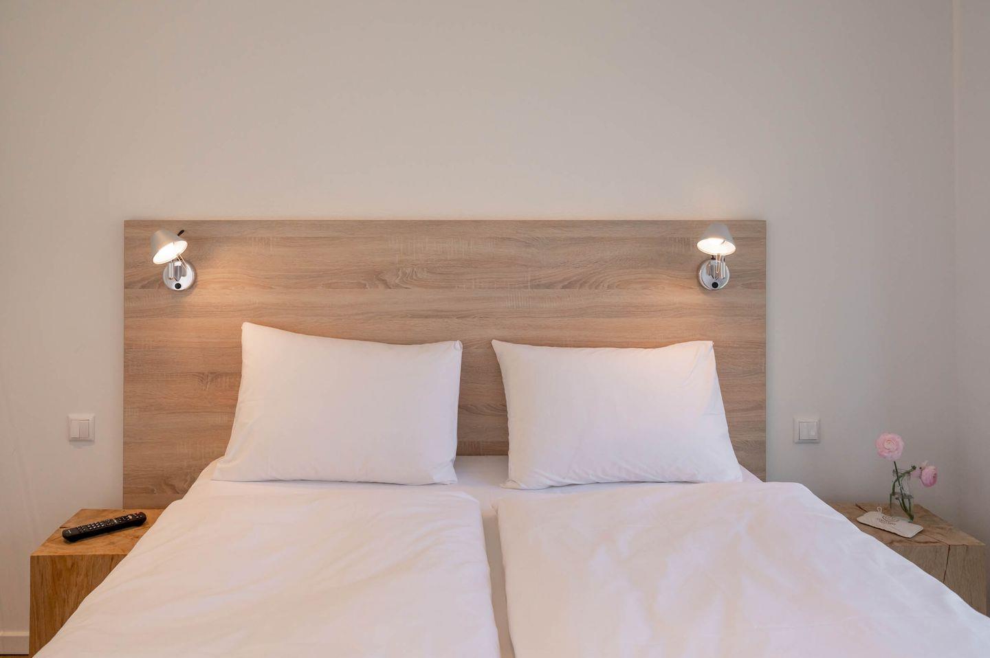 Wir sind der Überzeugung, dass ein guter Schlaf der wichtigste Faktor für einen erholsamen Urlaub und einen ausgeglichenen Start in den Tag darstellt. Deswegen haben wir viel Wert auf die Auswahl der Betten gelegt und uns für Coco-Mat-Betten aus Griechenland entschieden. Die hinterleuchtete Bettrückwand sorgt für eine gemütliche Atmosphäre und lädt dazu ein, den Tag an der Küste in Ruhe ausklingen zu lassen. Genießen Sie nach dem Aufwachen am Morgen den Blick ins Grüne oder starten Sie mit einem Kaffee/Tee und einer Folge ihrer Lieblingsserie auf einem der schlafzimmereigenen Fernseher. Ein doppelter Kleiderschrank in jedem Schlafzimmer hält genügend Platz bereit, um alles Wichtige zu verstauen und aufzuhängen.