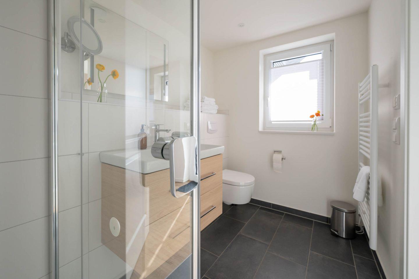 Das Appartement Feenja verfügt über ein großzügiges Badezimmer mit Dusche (Duschkopf verfügt über vier Funktionen), Waschbecken, Handtuchtrockner, Fußbodenheizung, Kosmetikspiegel und WC. Zusätzlich zum Badezimmer verfügt Feenja über ein separates Gäste-WC.