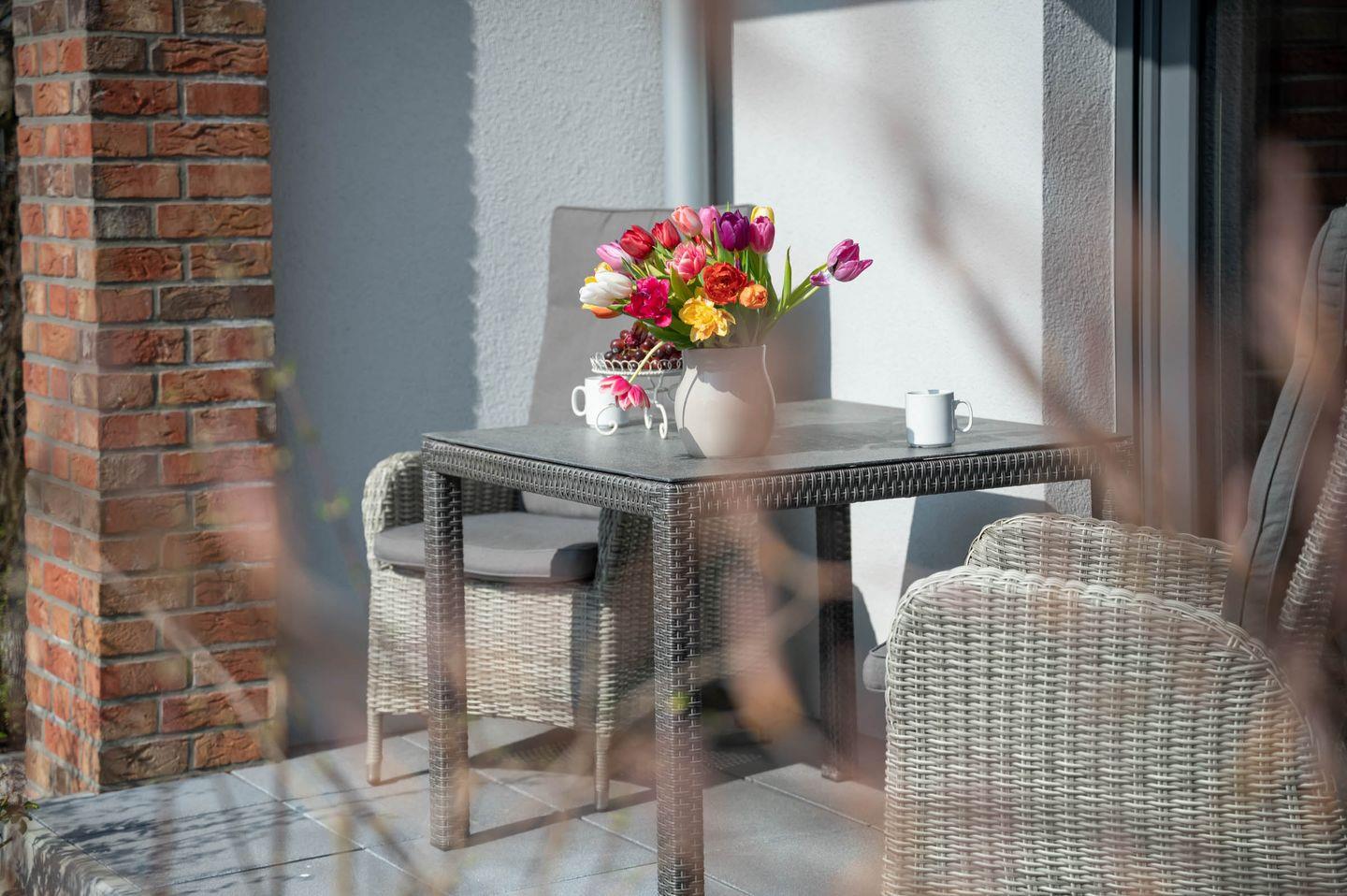 Terrasse: Gartenmöbel, Sonnenschirm, mit Strandkorb