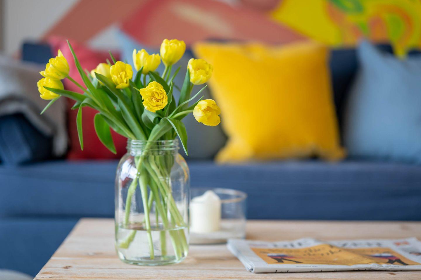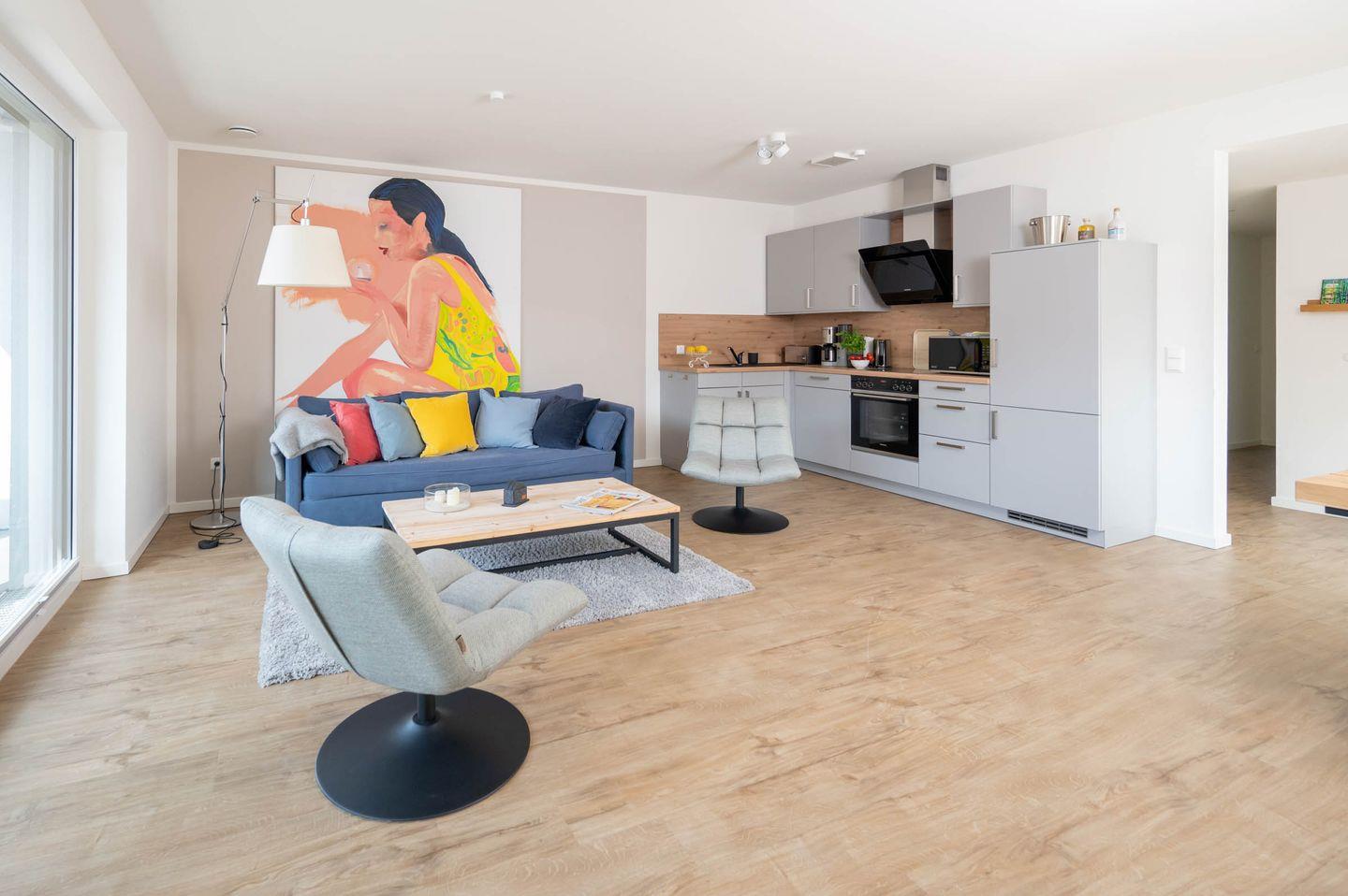 Das Wohnzimmer ist der ideale Ort für einen Spielenachmittag, zum Schmökern in der Urlaubslektüre oder für den Filmabend mit der Familie. Das gemütliche Sofa und zwei separate Sessel bieten Platz für alle Mitreisenden. Niklas Wendt, ein befreundeter Künstler, hat uns für jedes der vier Apartments eins seiner Kunstwerke als Leihgabe überlassen. Kommen Sie für weitere Informationen gerne auf uns zu.