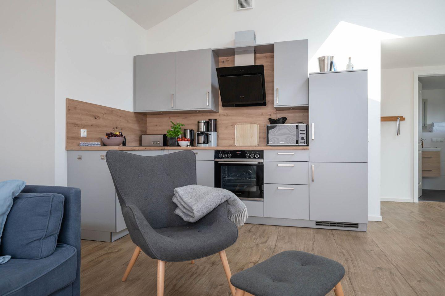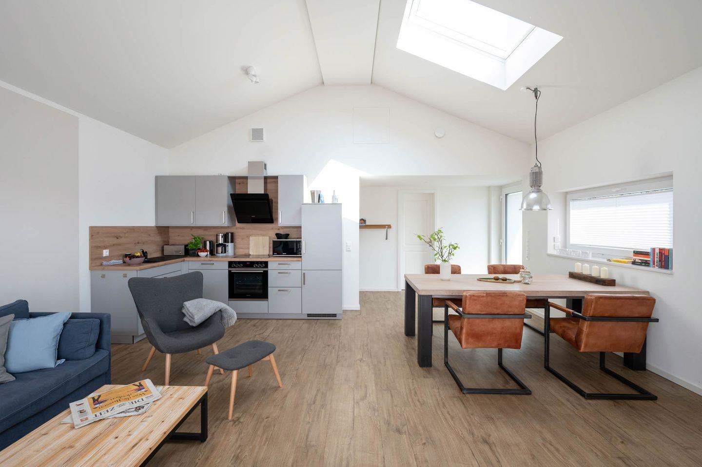 Die zum Wohnraum hin offene Küche lässt wenig Wünsche offen. Von der Zubereitung des Frühstücks samt Kaffee und Tee bis hin zum opulenten Mittag- oder Abendessen, jeder Genießer und Hobbykoch kommt hier ganz und gar auf seine Kosten. Der Esstisch ermöglicht ein gemütliches Zusammensitzen, auch nach dem Essen.