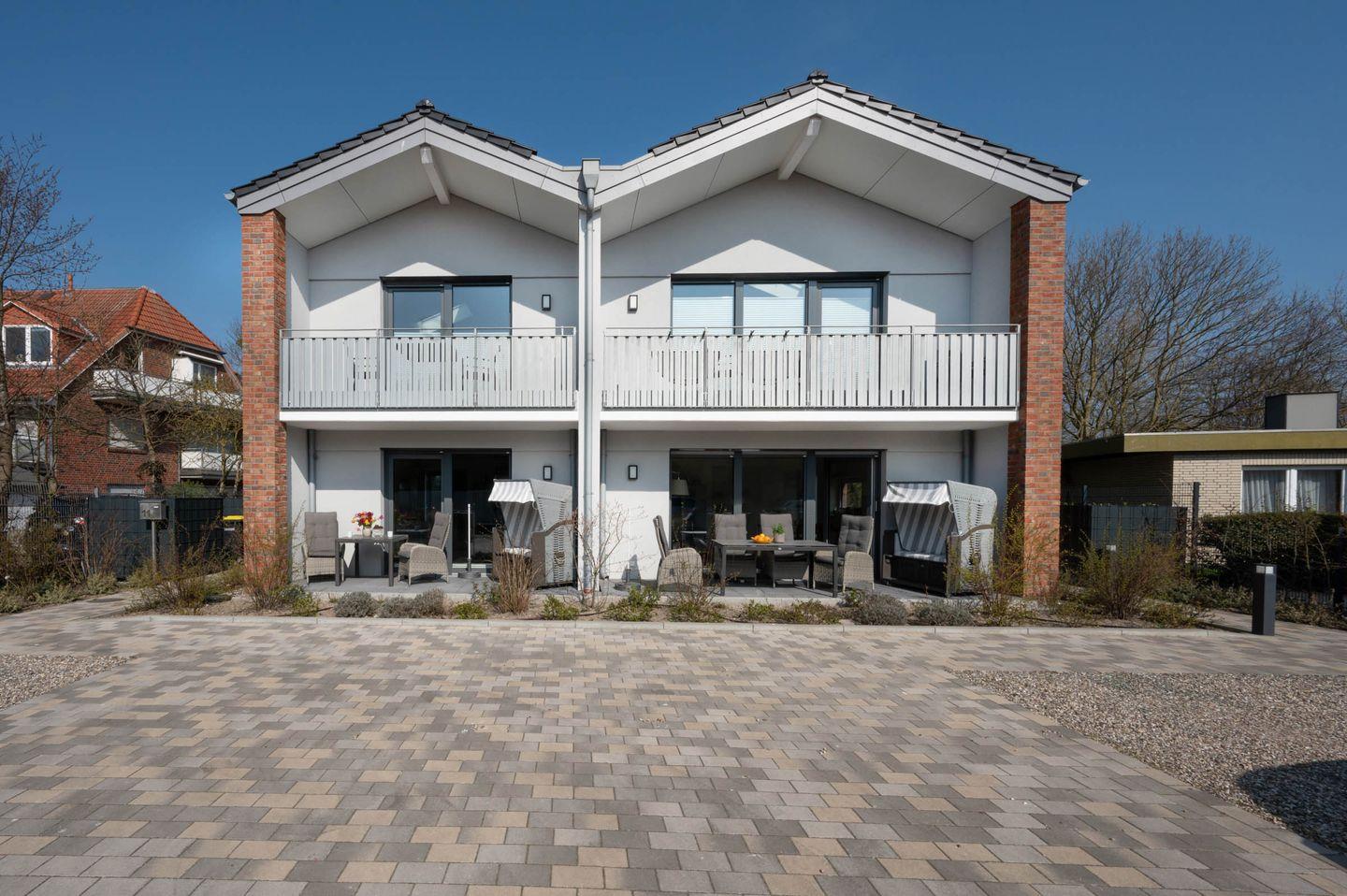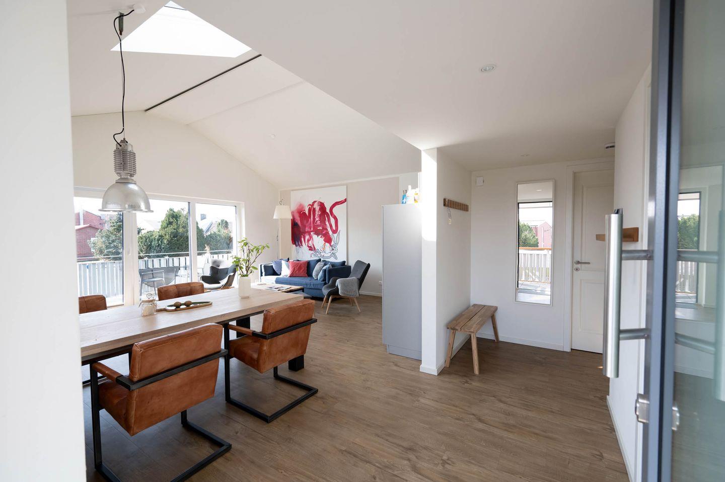 Der Neubau bietet ein gemütliches, naturverbundenes Ambiente durch die Kombination aus norddeutschem Charme und hochwertigem, nachhaltigem Design. Der Blick ins Grüne aus den beiden Schlafzimmern und die Möglichkeit, die Sonne auf dem eigenen Balkon zu genießen, steigert den Wohlfühlfaktor. Doch selbst wenn das gute Wetter mal ausbleibt, ist das kuschelige Sofa der perfekte Rückzugsort.