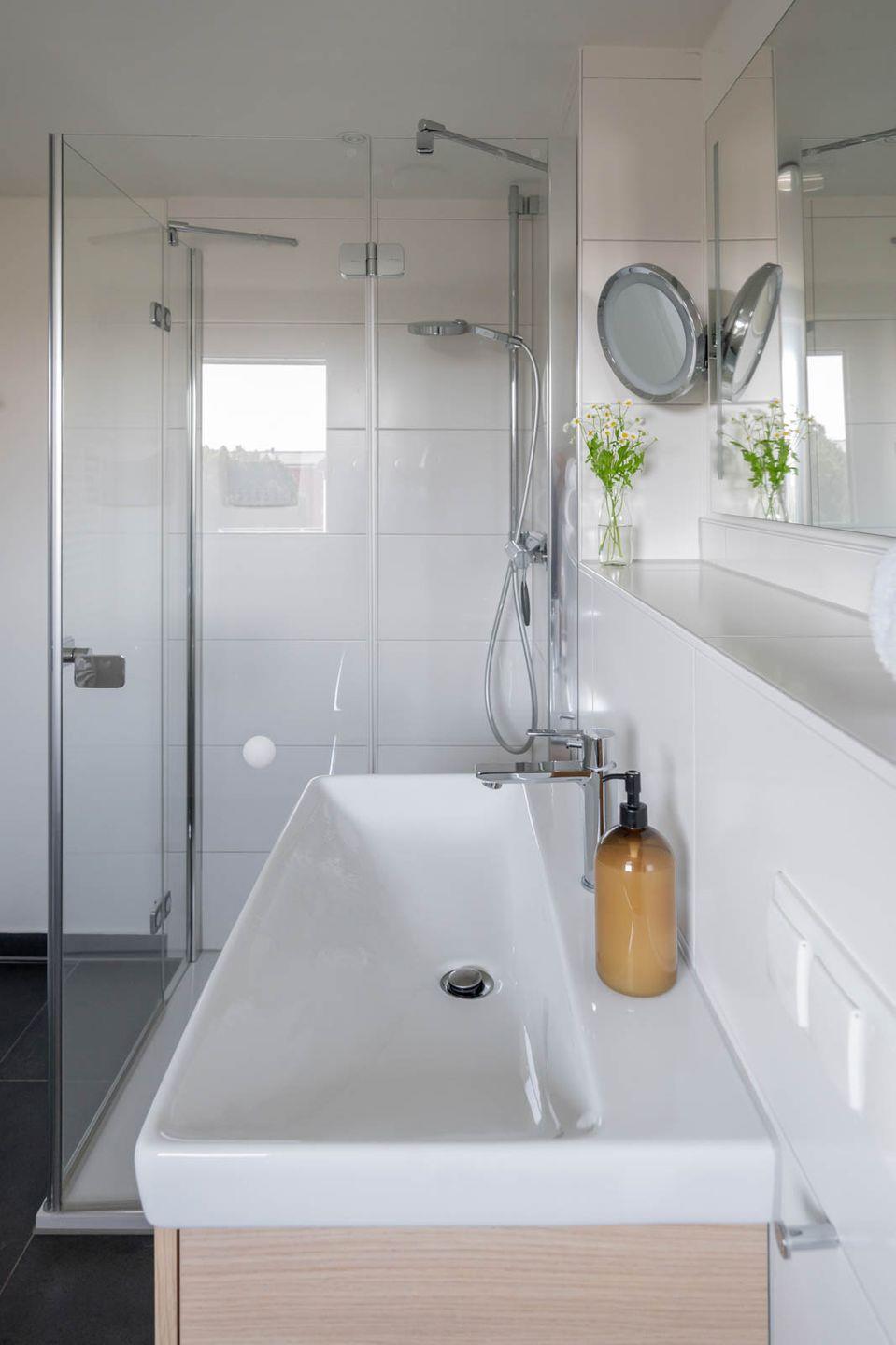 Badezimmer: Dusche, Handtuchheizung, Fön, Kosmetikspiegel