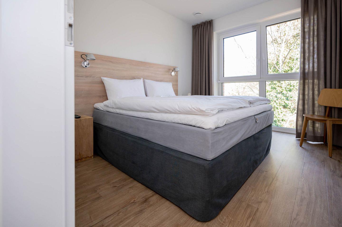 Wir sind der Überzeugung, dass ein guter Schlaf der wichtigste Faktor für einen erholsamen Urlaub und einen ausgeglichenen Start in den Tag darstellt. Deswegen haben wir viel Wert auf die Auswahl der Betten gelegt und uns für Coco-Mat-Betten aus Griechenland entschieden. Die hinterleuchtete Bettrückwand sorgt für eine gemütliche Atmosphäre und lädt dazu ein, den Tag an der Küste in Ruhe ausklingen zu lassen. Genießen Sie nach dem Aufwachen am Morgen den Blick ins Grüne oder starten Sie mit einem Kaffee/Tee und einer Folge ihrer Lieblingsserie auf einem der schlafzimmereigenen Fernseher. Ein doppelter Kleiderschrank in jedem Schlafzimmer hält genügend Platz bereit, um alles Wichtige zu verstauen und aufzuhängen.
