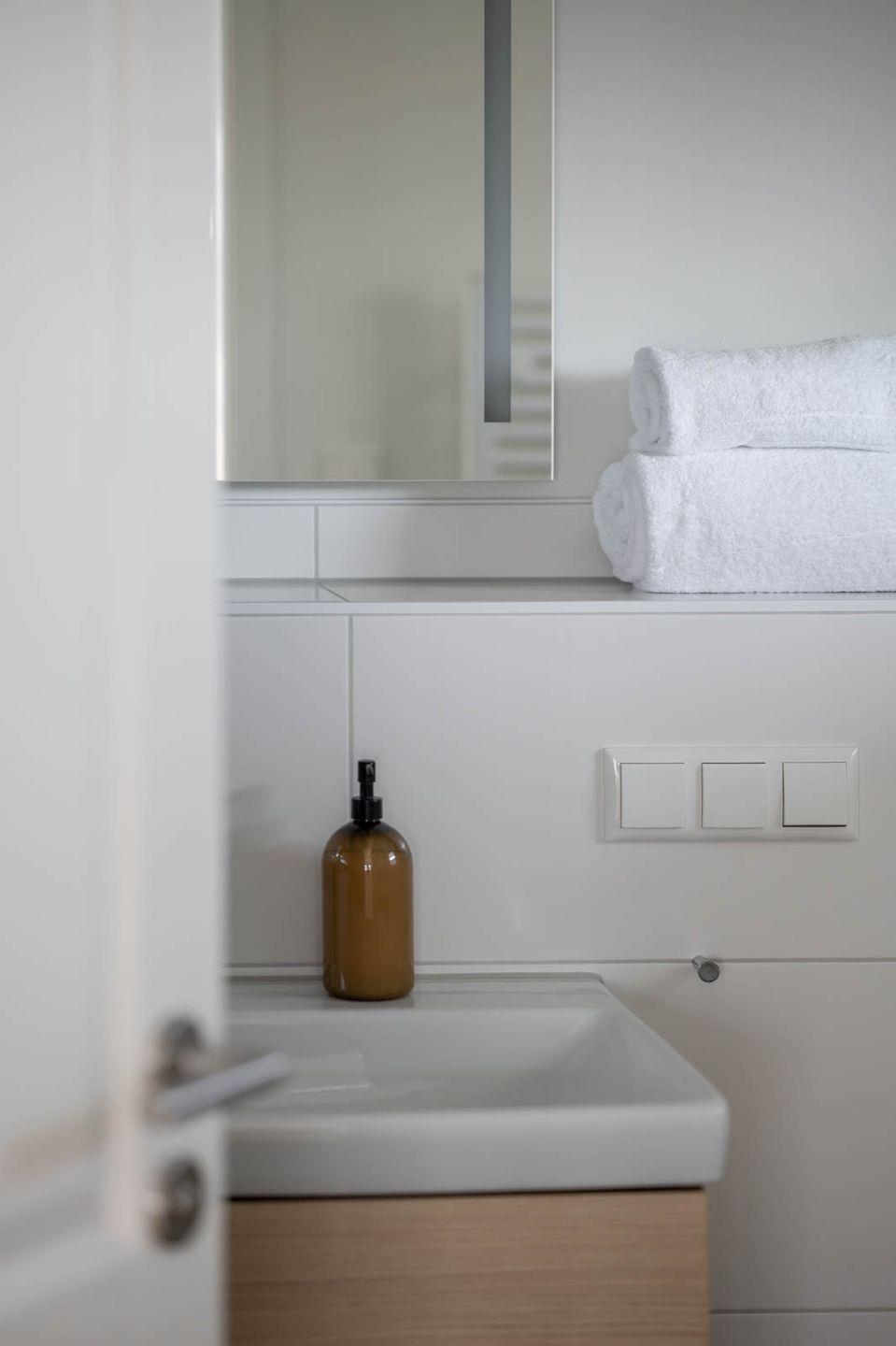 Das Appartement Beeke verfügt über ein großzügiges Badezimmer mit Dusche (Duschkopf verfügt über vier Funktionen), Waschbecken, Handtuchtrockner, Fußbodenheizung, Kosmetikspiegel und WC. Zusätzlich zum Badezimmer verfügt Beeke über ein separates Gäste-WC.