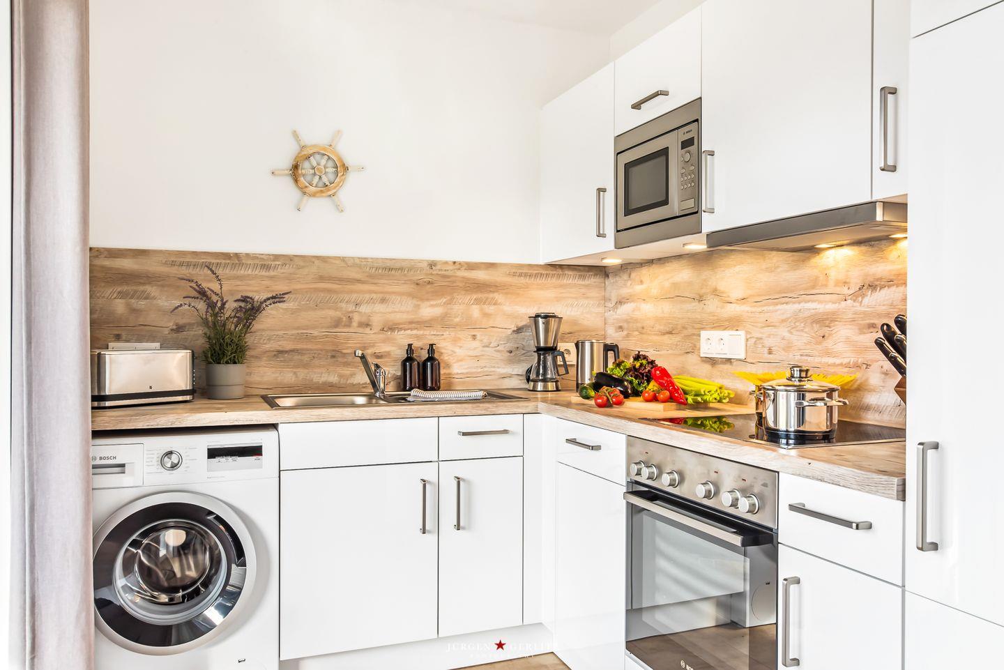 Hobbyköche können sich in der modernen Nobilia-Küche mit hochwertiger Ausstattung austoben und ein tolles Menü zaubern. Zum Lunch trifft man sich an dem schönen Esstisch, der Platz für vier Personen bietet. Und den abschließenden Sundowner nimmt man bei Sonnenuntergang auf der angrenzenden, windgeschützten Terrasse ein.