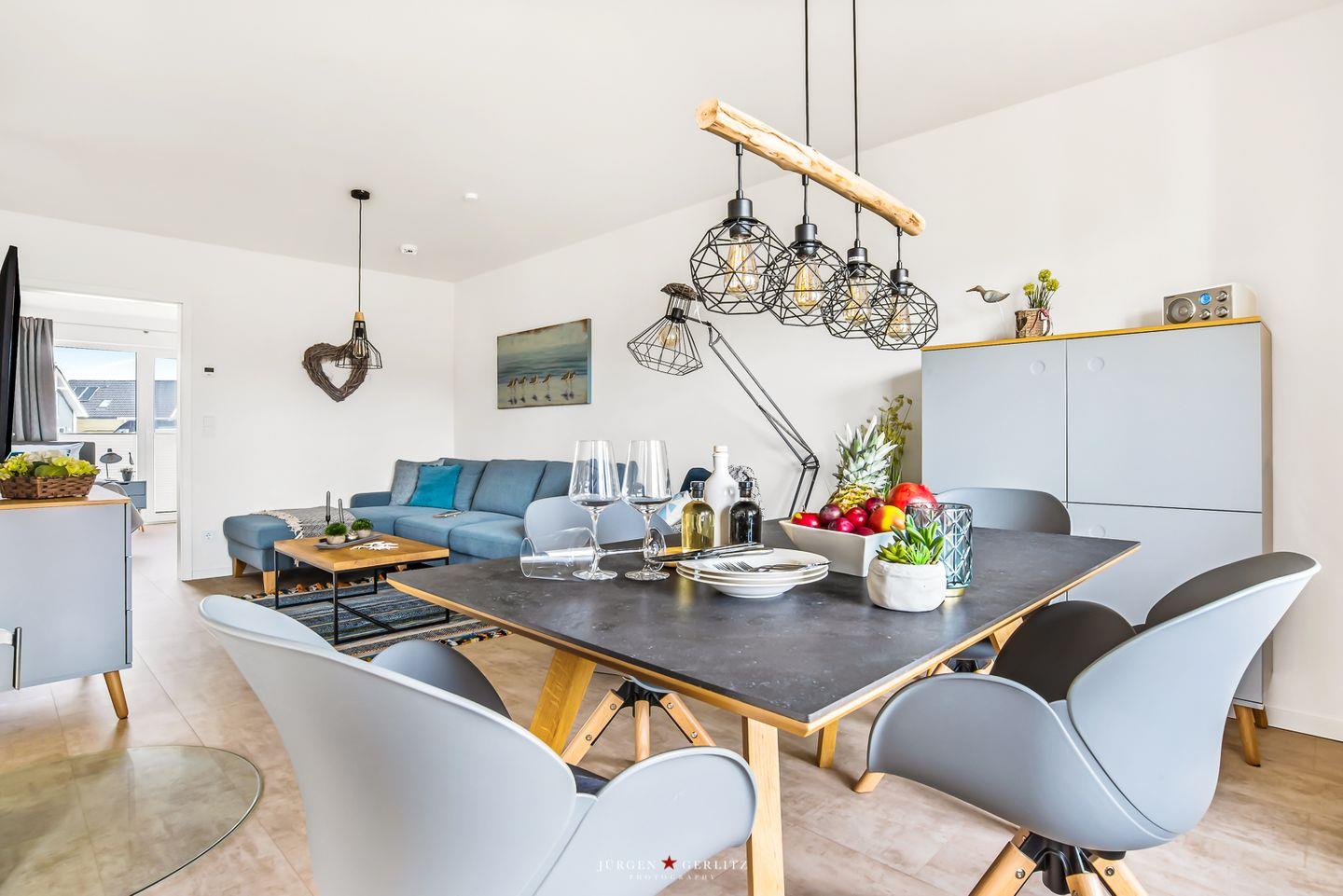 Diese wunderschöne Ferienwohnung liegt im Erdgeschoß eines 4-Parteien-Ferienhauses und verfügt über einen lichtdurchfluteten Wohn- u. Essbereich. Mit viel Liebe zum Detail wurde die Wohnung vom Eigentümer eingerichtet. Skandinavisches Design der Ausstattung trifft auf maritimes Flair. Ein kuscheliger Lounge-Sessel und ein gemütliches Sofa im Wohnraum laden zum Chillen ein. Wenn der Deich in Nebel gehüllt wird, sorgt ein Flatscreen-TV im Wohnbereich für die notwendige Abwechslung.