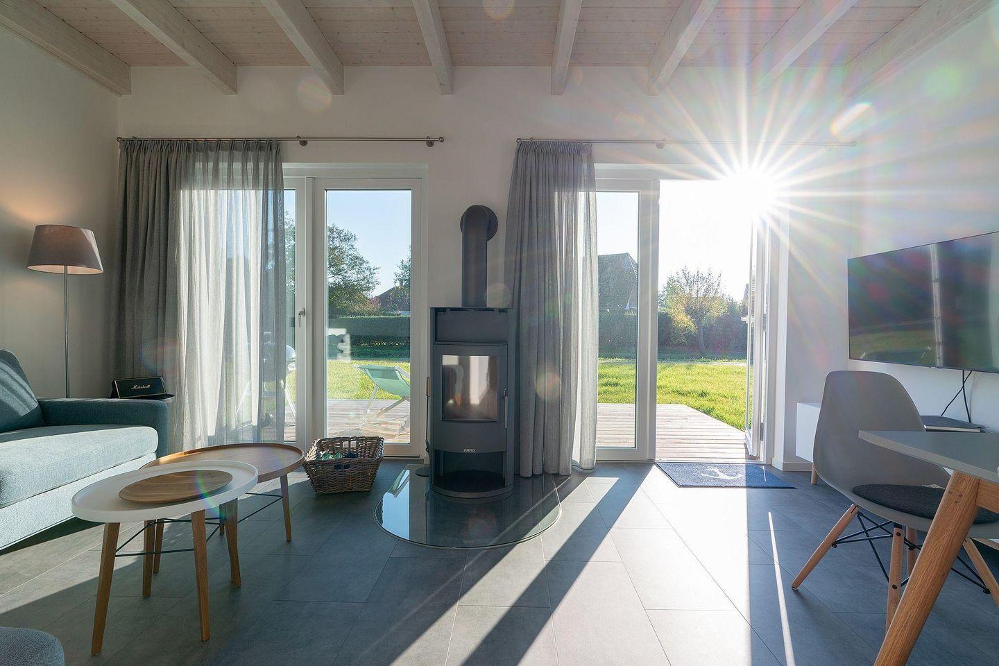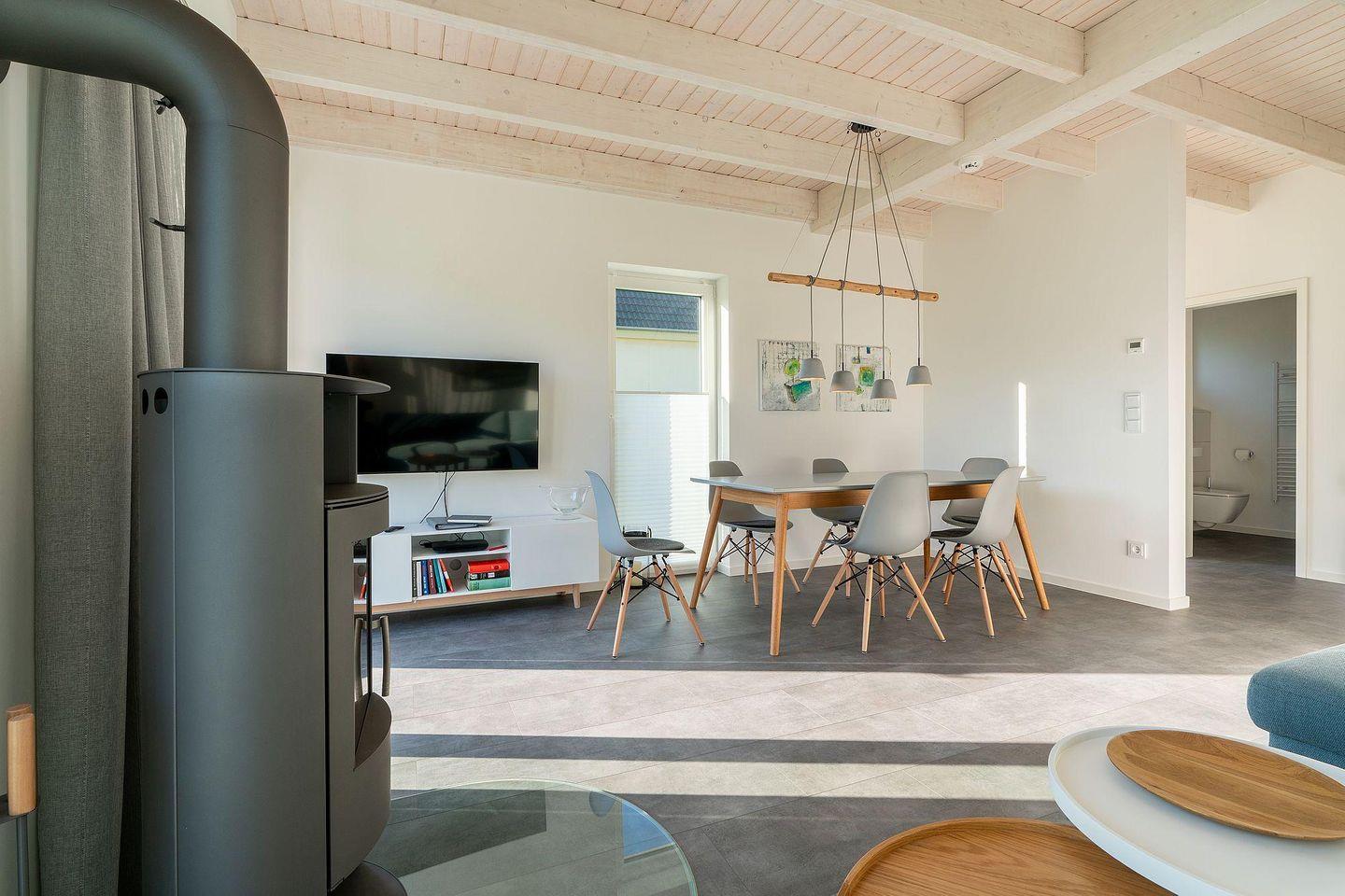 Linker Hand befindet sich ein großzügiges (ausziehbares) Ecksofa mit Wohlfühlgarantie. Hier lässt es sich gemütlich sitzen, klönen, lesen, fernsehen und das Feuer im Kamin genießen. Dieser steht im Zentrum des Raumes zwischen den beiden großen Terrassenfenstern mit Blick ins Grüne. Für den gemütlichen Spieleabend liegen Gesellschaftsspiele bereit. Und natürlich steht auch ein moderner Flachbildfernseher zur Verfügung, der über Magenta TV mit 100 Sendern verbunden ist und Zugang zu diversen Mediatheken bietet.