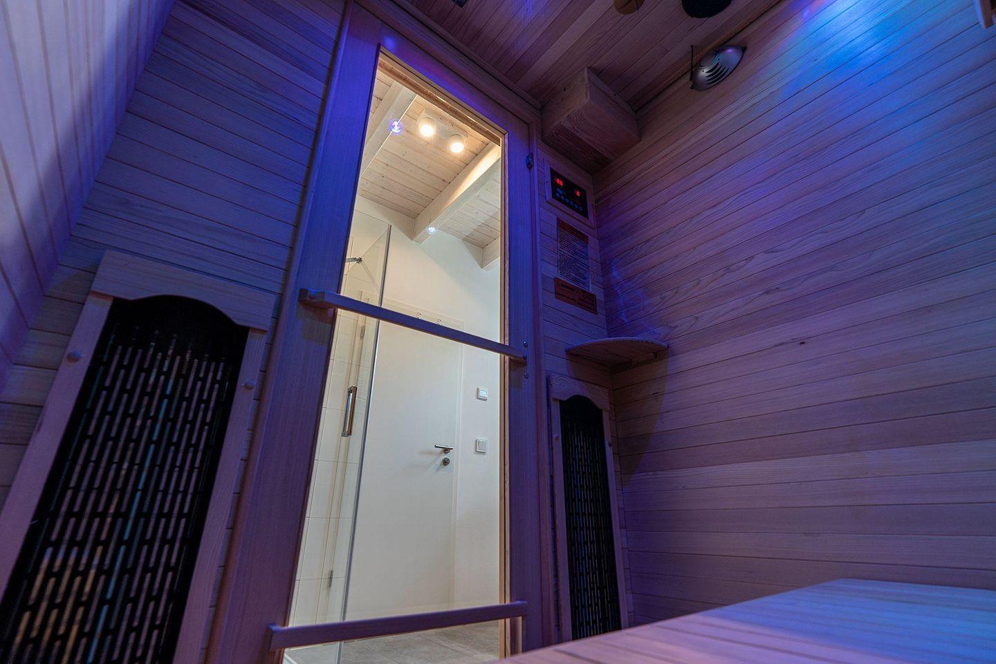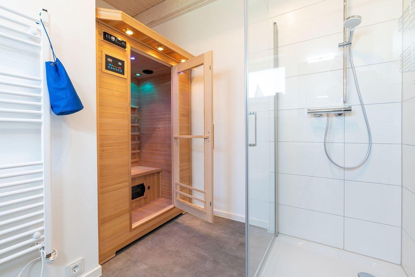 Das untere Badezimmer geht ebenso wie die Küche vom Flur ab. Es verfügt über eine ebenerdige Dusche, einen Waschtisch mit ausreichend Ablagefläche und einen Handtuchwärmer sowie eine Toilette. Für das Highlight an kalten Herbst- oder Wintertagen sorgt eine Infrarotkabine mit entspannender Wärme.