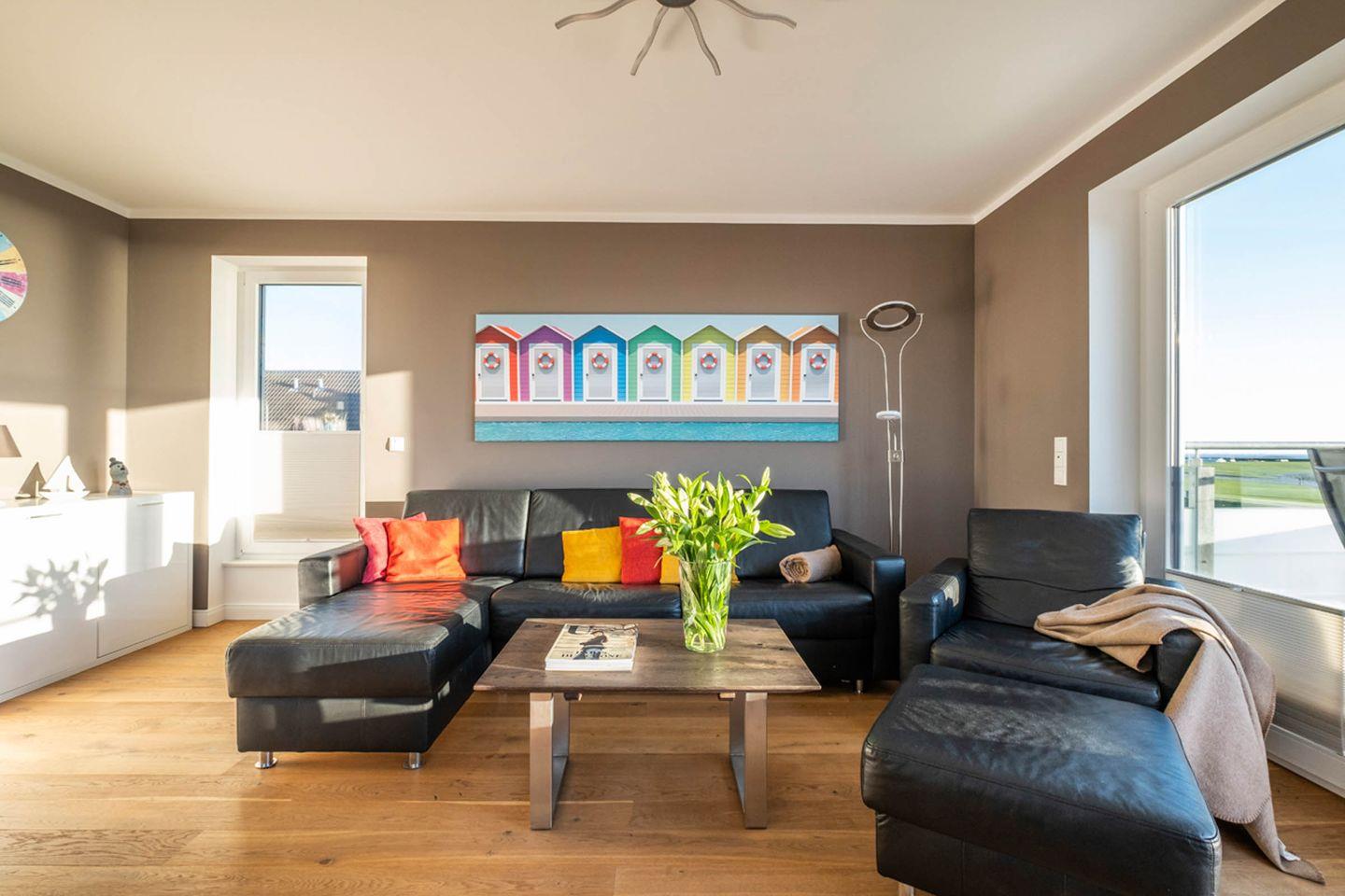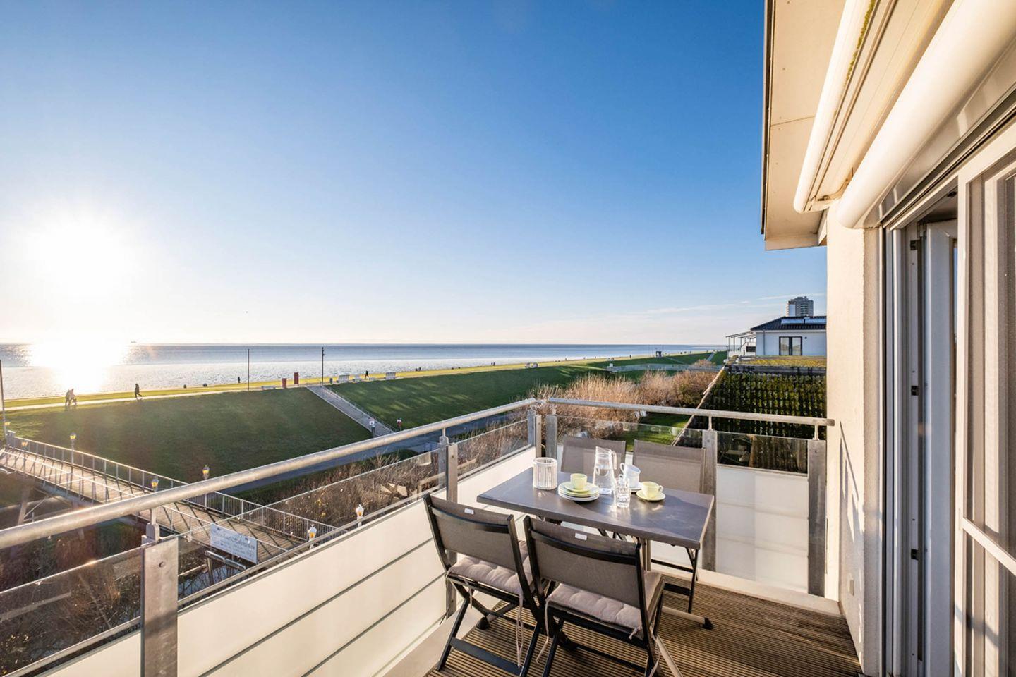 Die Ferienwohnung 4.1 ist eine tolle, helle 3-Raum-Wohnung mit Balkon und unglaublichem Deich-, Strand- und Meerblick! Die Küche ist separat, jedoch durch einen Tresen zum Essbereich hin integriert. Der Essbereich ist Teil des Wohnzimmers. Das Duschbad verfügt über eine geräumige, ebenerdige Dusche, WC, Handtuchtrockner und Haar-Föhn. Die Wohnung verfügt auch zusätzlich über ein Gäste-WC. Die familienfreundliche Wohnung 4.1 ist mit Gesellschaftsspielen, DVD und Büchern ausgestattet. Auch verfügt sie an allen Fenstern und Türen über Fliegenschutzgitter. Der Fußboden ist Echtholz-Parkett.