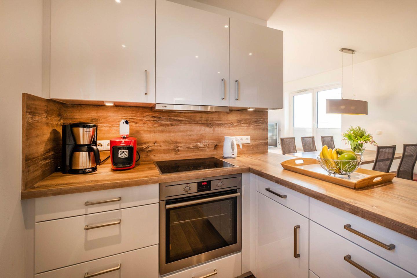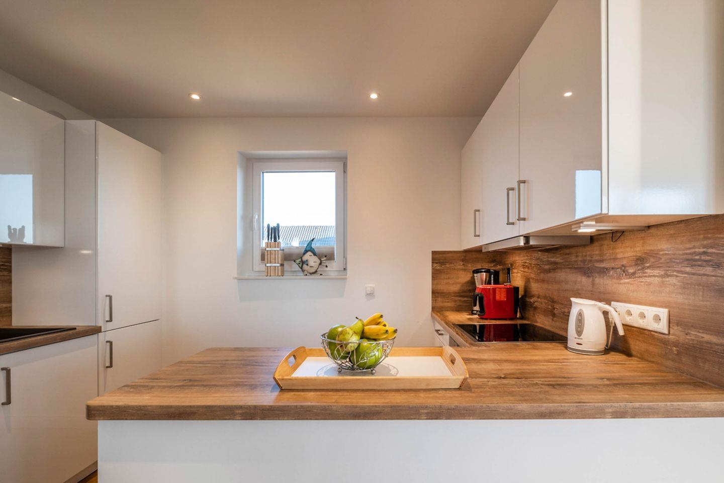 Küche: Geschirrspüler, Cerankochfeld, Mikrowelle, Backofen, Kühlschrank mit Gefrierfach.
