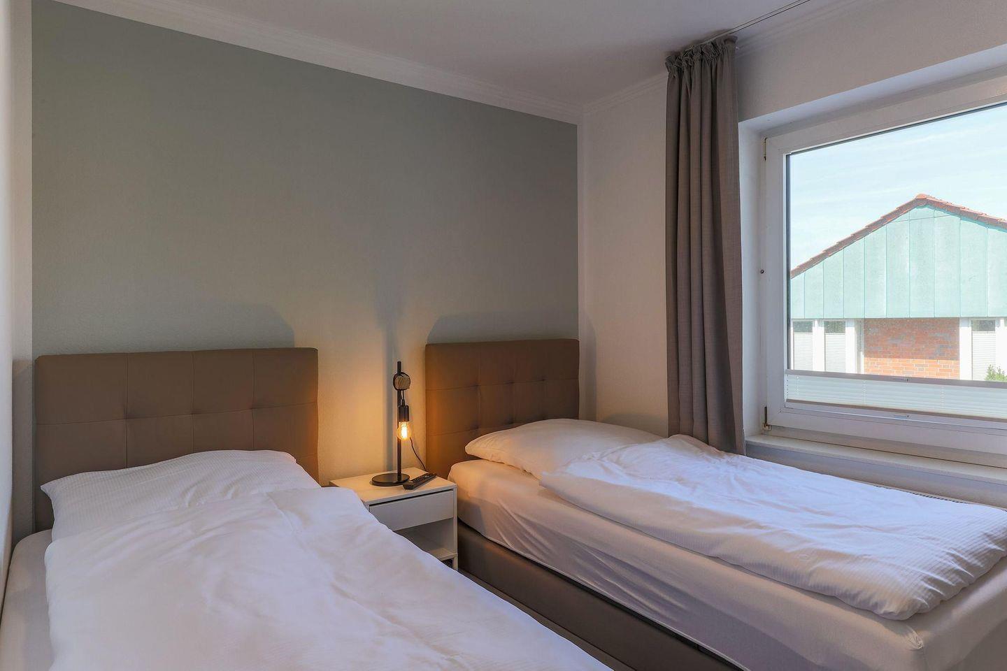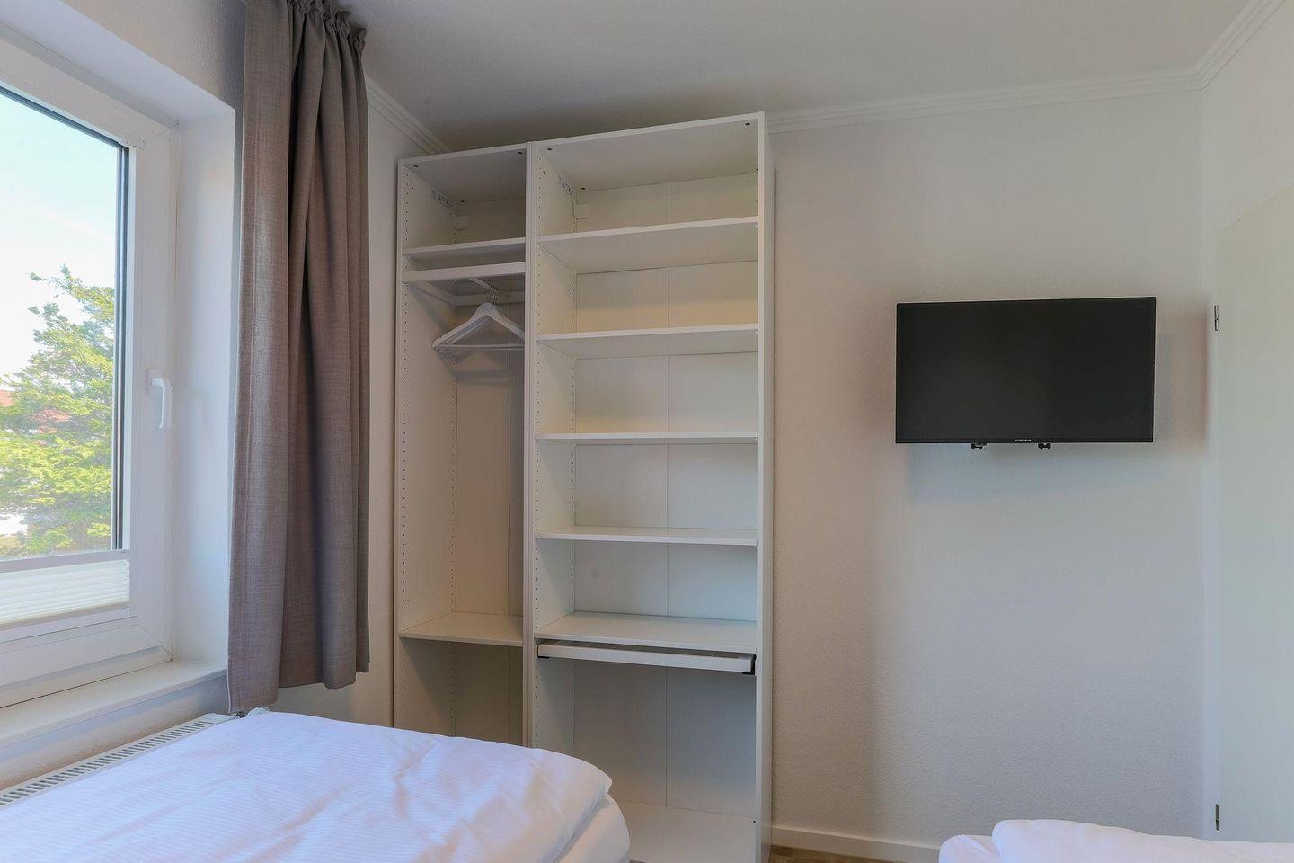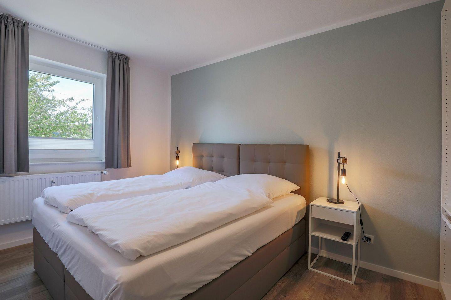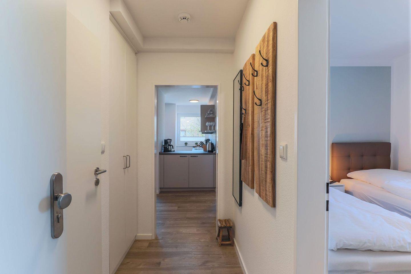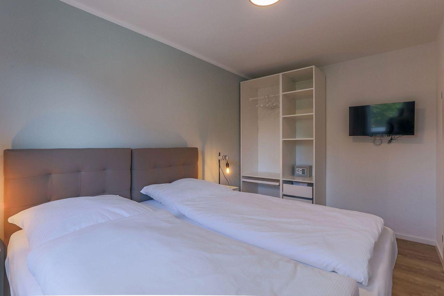 Ein heller Flur empfängt Sie mit einer modernen Garderobe und Zugängen zu sämtlichen Zimmern. Die Ferienwohnung bietet mit 2 Schlafzimmern Platz für 4 Personen. Eines der zwei Schlafzimmer ist mit einem hochwertigen Doppel-Boxspringbett (180 x 200) und ein weiteres mit zwei Einzel-Boxspringbetten (je 90 x 200) ausgestattet. Alle Betten verfügen über Bettkästen, sodass Sie Ihre Koffer für die Urlaubszeit verstauen können. In beiden Schlafzimmern befinden sich wandhängende TV-Flatscreens für den individuellen Fernsehgenuss.