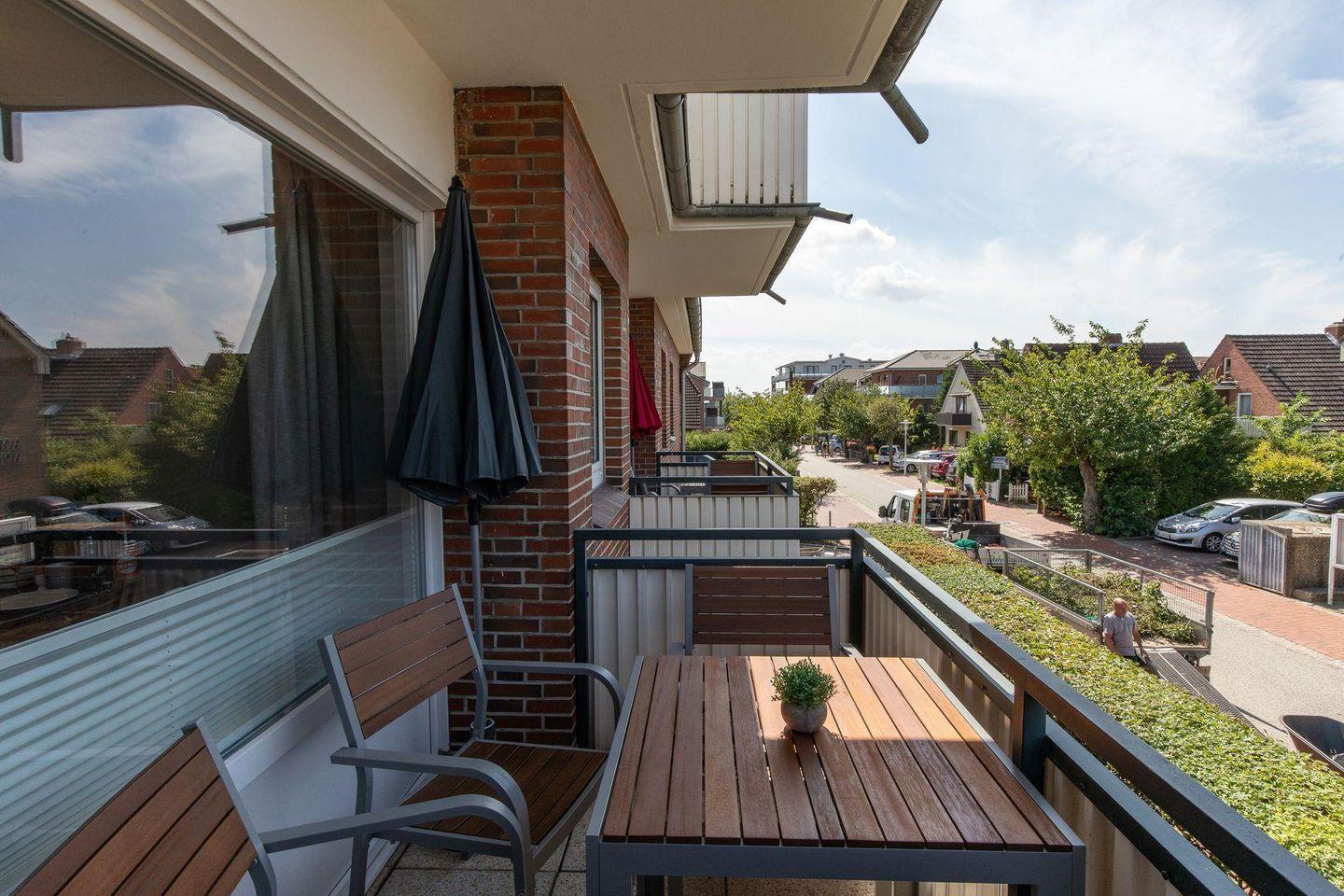 Balkon: Südwest-Lage mit hochwertigen Balkonmöbeln und Sonnenschirm