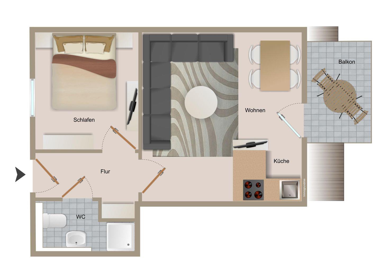 Ein heller Flur empfängt Sie mit einer modernen Garderobe und Zugängen zu sämtlichen Zimmern. Die Ferienwohnung bietet mit 1 Schlafzimmer Platz für 2 Personen. Das Schlafzimmer ist mit einem hochwertigen Doppel-Boxspringbett (160 x 200) ausgestattet und verfügt über einen Bettkasten, sodass Sie Ihre Koffer für die Urlaubszeit verstauen können. Im Schlafzimmer befindet sich ein wandhängendes TV-Flatscreen für den individuellen Fernsehgenuss.