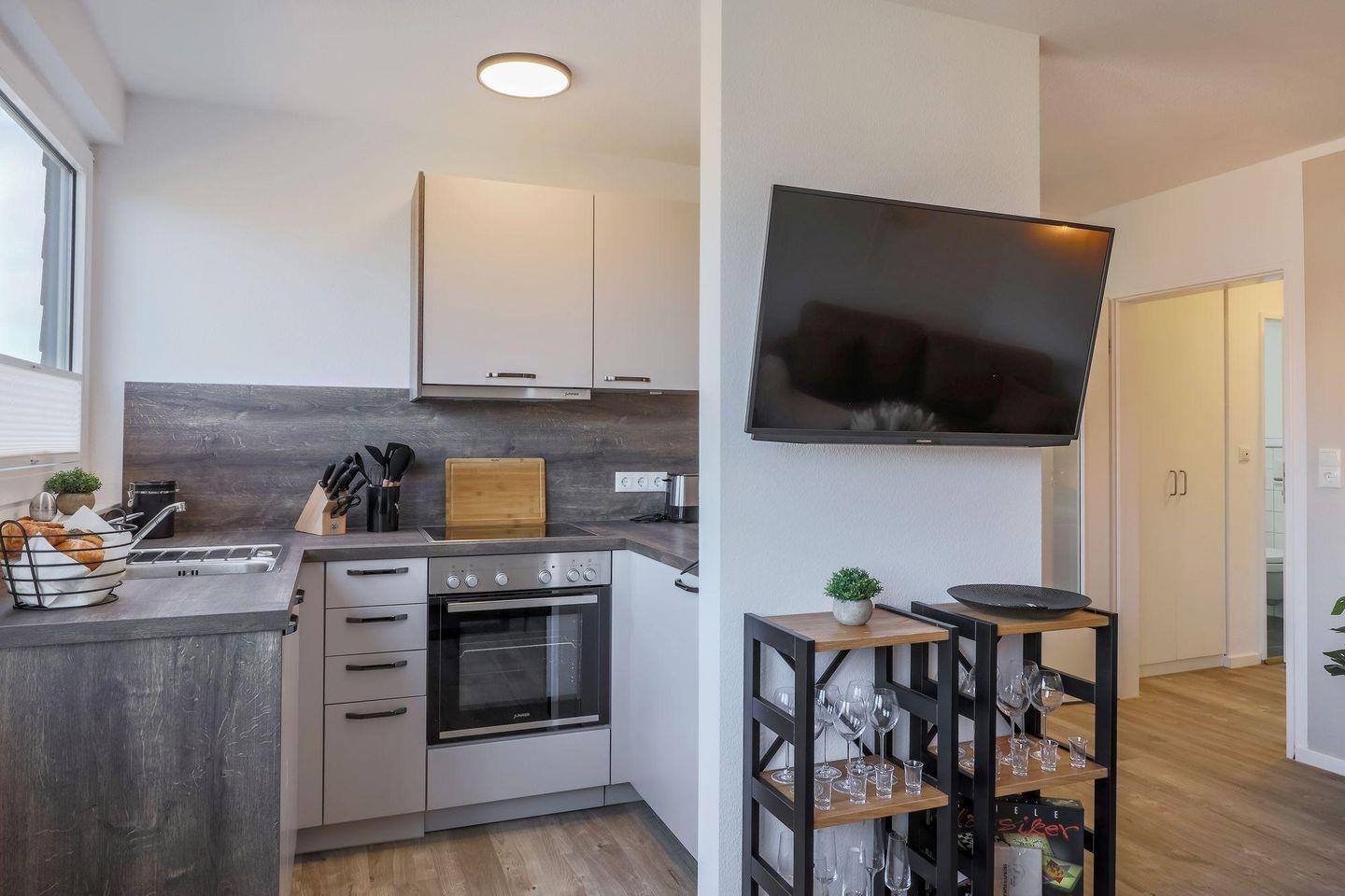 Küchenzeile: Cerankochfeld, Geschirrspüler, Kühlschrank mit Gefrierfach, Filterkaffee, Wasserkocher, Toaster, Mikrowelle