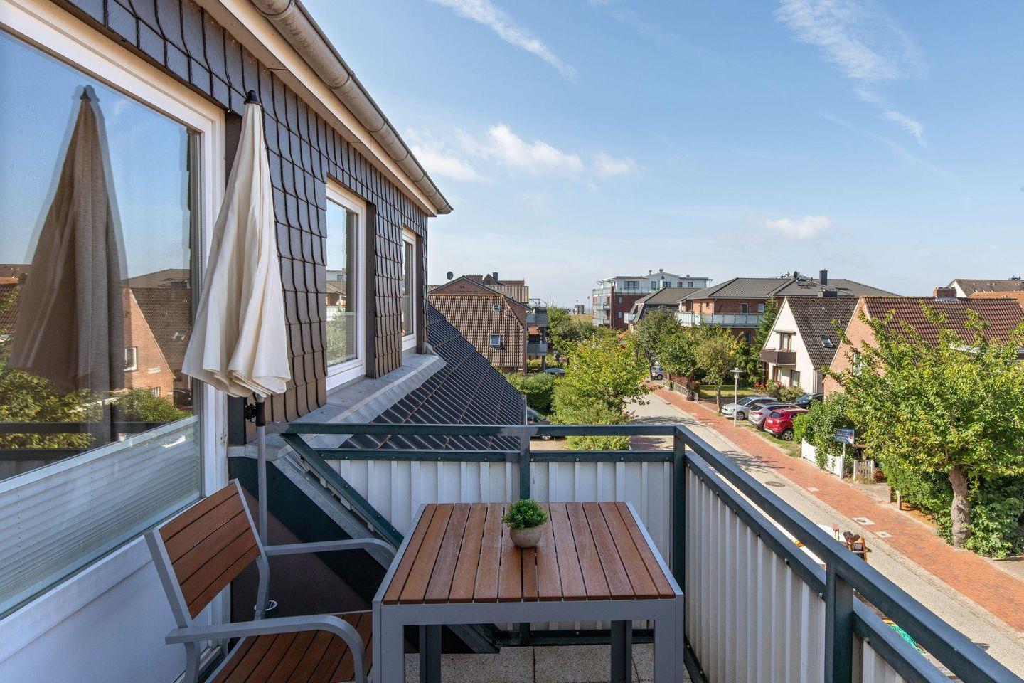 Ein modernes Bad bietet eine komfortable Dusche mit niedrigem Einstieg sowie eine Handtuchheizung. Das Herzstück der Wohnung ist das gemütliche Wohnzimmer mit einer hochwertigen, offenen Küche. Hier finden Sie eine Spülmaschine, ein Cerankochfeld, eine Filterkaffeemaschine und einen Kühlschrank, der mit einem Gefrierfach ausgestattet ist. Ein schöner Essbereich, eine kuschelige Couchgarnitur und ein großer TV-Flatscreen vervollständigen den Wohn-und Küchenbereich. Von dem Wohnbereich gelangen Sie auf einen großzügigen, sonnigen Süd-Westbalkon, der seitlich einen Blick zur Nordsee bietet. Ausgestattet mit hochwertigen Balkonmöbeln können Sie hier bei einem Glas Wein entspannte Abende mit Ihren Liebsten genießen.