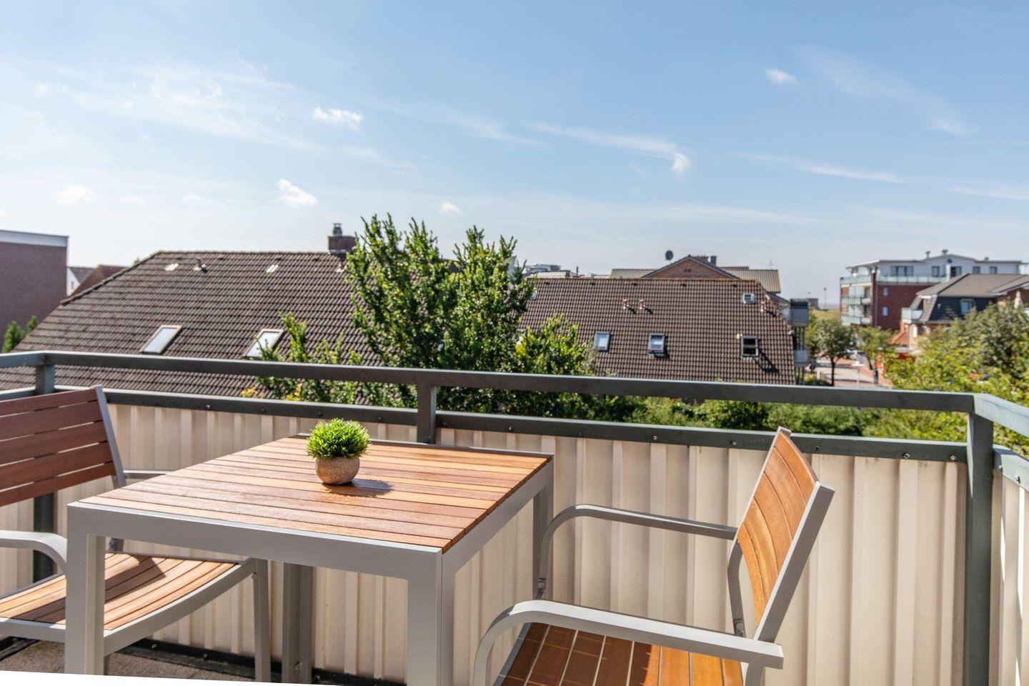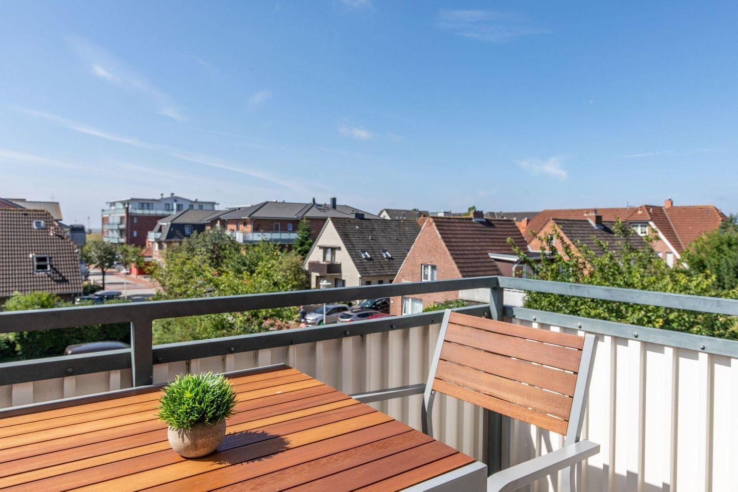 Ein modernes Tageslichtbad bietet eine komfortable Dusche mit niedrigem Einstieg. Das Herzstück der Wohnung ist das gemütliche Wohnzimmer mit einer angrenzenden, separaten Küche. Hier finden Sie eine Spülmaschine, ein Cerankochfeld, eine Filterkaffeemaschine und einen Kühlschrank, der mit einem Gefrierfach ausgestattet ist. Ein schöner Essbereich, eine kuschelige Couchgarnitur und ein großer TV-Flatscreen vervollständigen den Wohnbereich. Von hier gelangen Sie auf einen Südbalkon mit Ausblick über die Dächer von Büsum und mit hochwertigen Balkonmöbeln ausgestattet. Hier können Sie bei einem Glas Wein entspannte Abende mit Ihren Liebsten genießen.