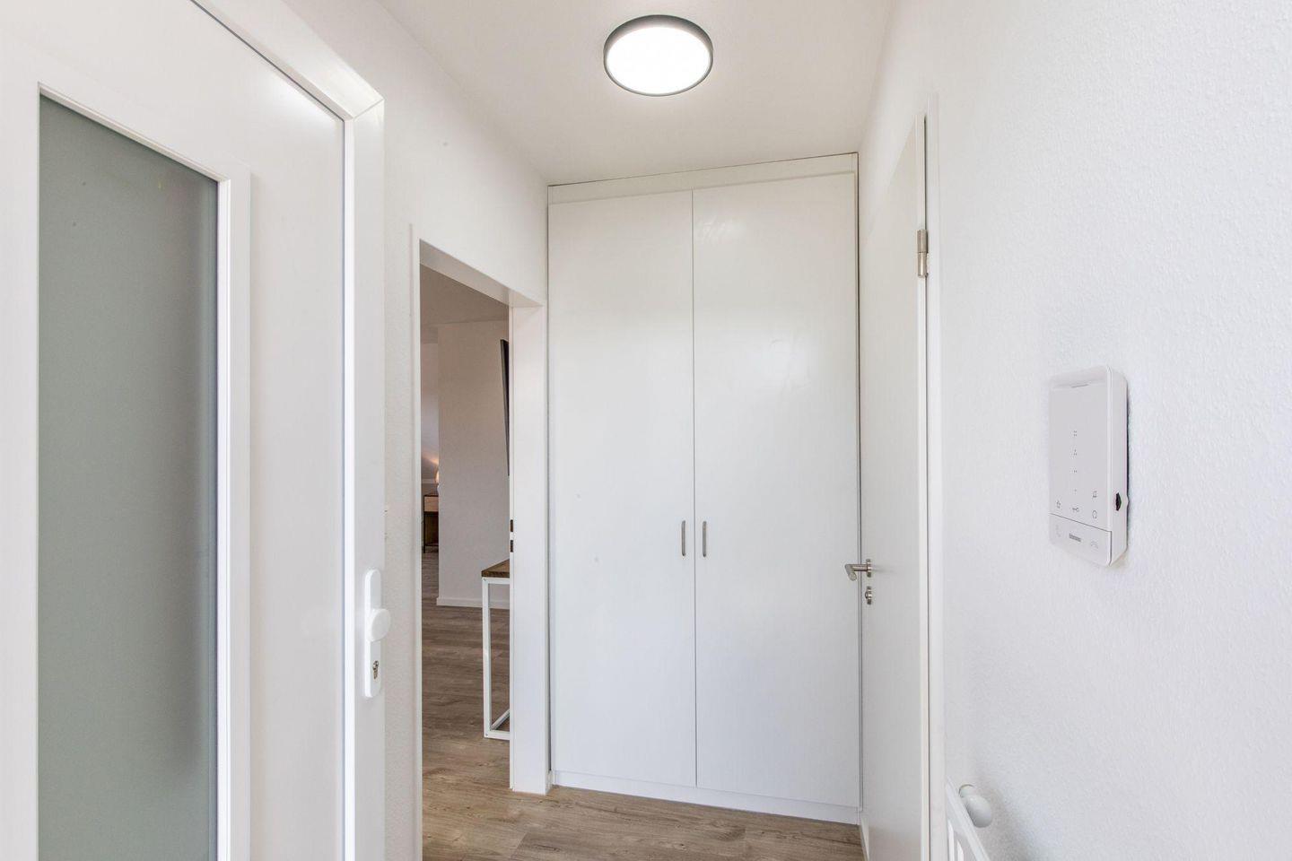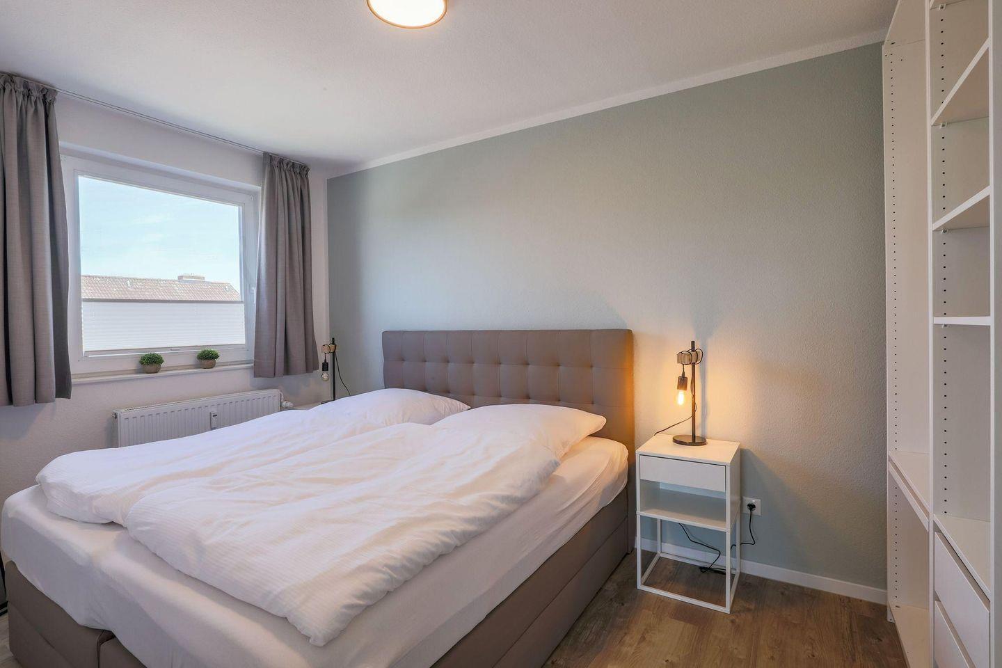 Ein heller Flur empfängt Sie mit einer modernen Garderobe und Zugängen zu sämtlichen Zimmern. Die Ferienwohnung bietet mit 1 Schlafzimmer Platz für 2 Personen. Das Schlafzimmer ist mit einem hochwertigen Doppel-Boxspringbett (180 x 200) ausgestattet. Das Bett verfügt über Bettkästen, sodass Sie Ihre Koffer für die Urlaubszeit verstauen können. Im Schlafzimmer befindet sich ein wandhängender TV-Flatscreen für den individuellen Fernsehgenuss.