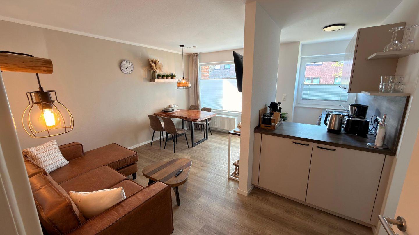 Vom eigenen Stellplatz geht‘s direkt in den Eingangsbereich des Apartmenthauses "Haus Treibholz" zur im Erdgeschoss gelegenen Ferienwohnung. Die 2021 neu sanierte Wohnung bietet mit liebevoll ausgestatteter Einrichtung einen hohen Wohlfühlcharakter.