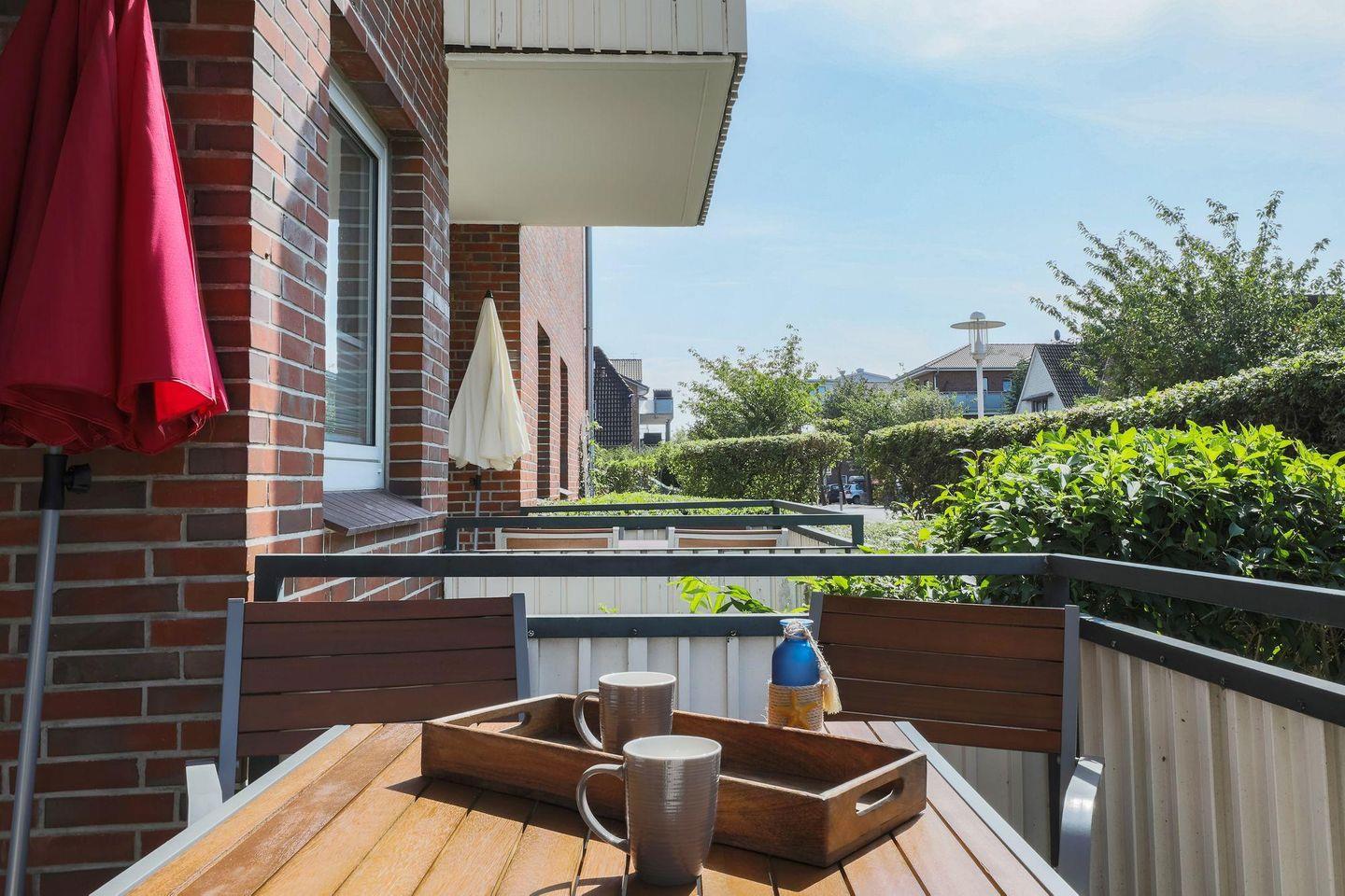 Balkon: Südwest-Lage mit hochwertigen Balkonmöbeln und Sonnenschirm